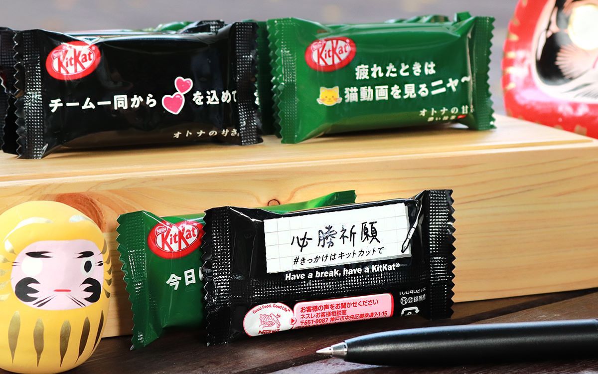 包裝正面印有14種不同的打氣小語,像是 :不要忘了為心充電、簡報一定會順利等,對應不同場合與心境,獻上最給力的應援;包裝背面也有可寫上祝福話語的特別設計。日本感十足的小巧包裝,適合分送給重視的親朋好友,不論是即將迎來的學校大考與畢業求職季,甚至是日常生活的每一天,都可以透過 KitKat巧克力送上最真誠的祝福。