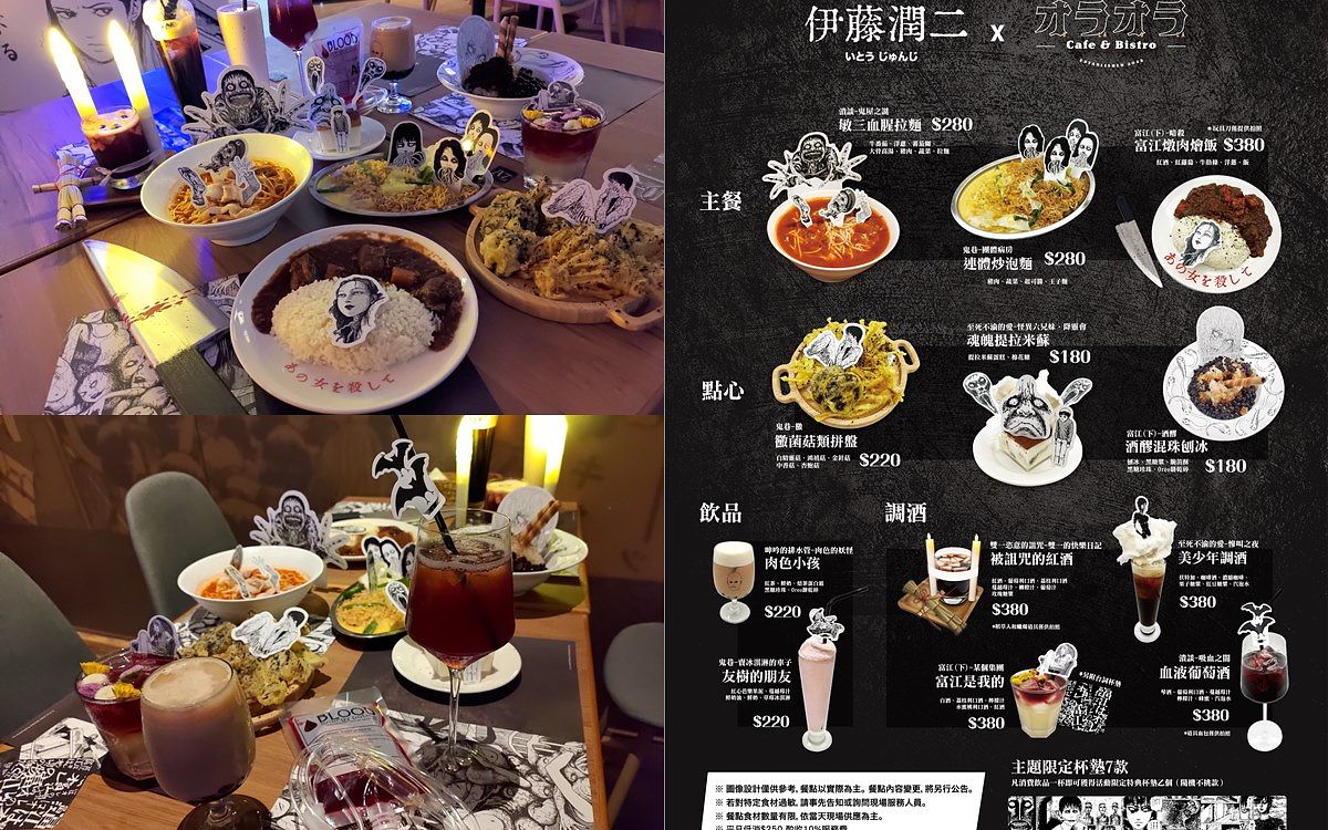 除了店內的恐怖氣氛,餐點這次也取材自伊藤潤二經典的漫畫篇章,共推出了三道主餐、三種甜點、及六款特調飲品。主餐有張著血盆大口的「敏三血腥拉麵」蕃茄起司拉麵、團體病房中的「連體炒泡麵」、以及浮現富江頭的「富江燉肉燴飯」紅酒燉牛肉燴飯。點心則有以「黴」篇章為發想概念的「黴菌菇類拼盤」、淋落感的富江「酒醪混珠刨冰」,以及怪異六兄妹的「魂魄提拉米蘇」。不論主餐或甜點皆裝飾著精美插卡,甚至還有小道具還原,聯名餐點除了可口,還帶有一點點的可怕,想來用餐的客人可得先做好心理準備。