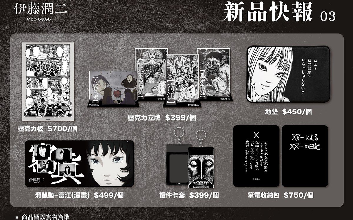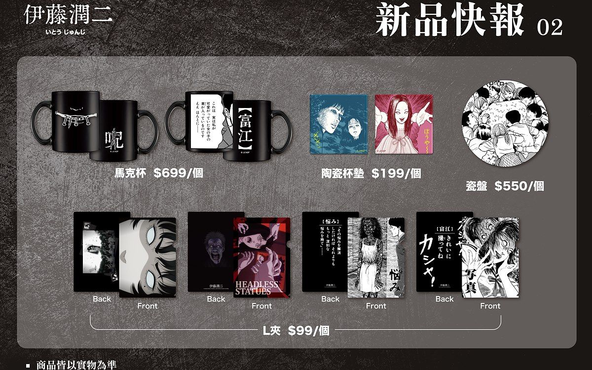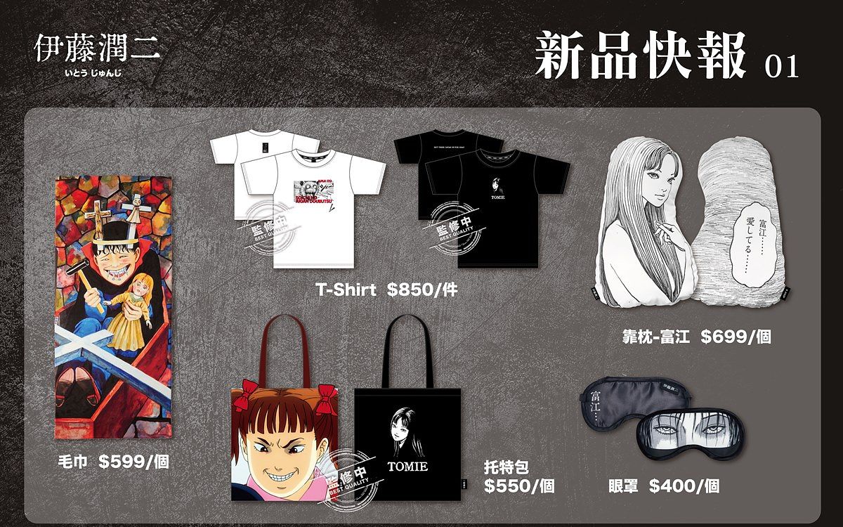 除了餐點以外,餐酒館現場還開放販售、預購全新系列「伊藤潤二」獨家周邊。這次「歐拉歐拉オラオラ」和動漫周邊品牌「FANFANS粉粉」合作,設計一系列恐怖又驚豔的正版商品,讓粉絲們都能夠把恐怖美學帶進生活日常之中,從雙一毛巾、富江靠枕、地墊、下詛咒的馬克杯、靈異杯墊、雙一日記筆電包等,一直到所有童年噩夢大集合的L夾、立牌等實用週邊,黑白漫畫風格真的讓人忍不住想「剁手」收藏。除了現場之外,這次的系列新品也能於「FANFANS粉粉」官網入手,喜歡伊藤潤二的粉絲們絕對不能錯過!
