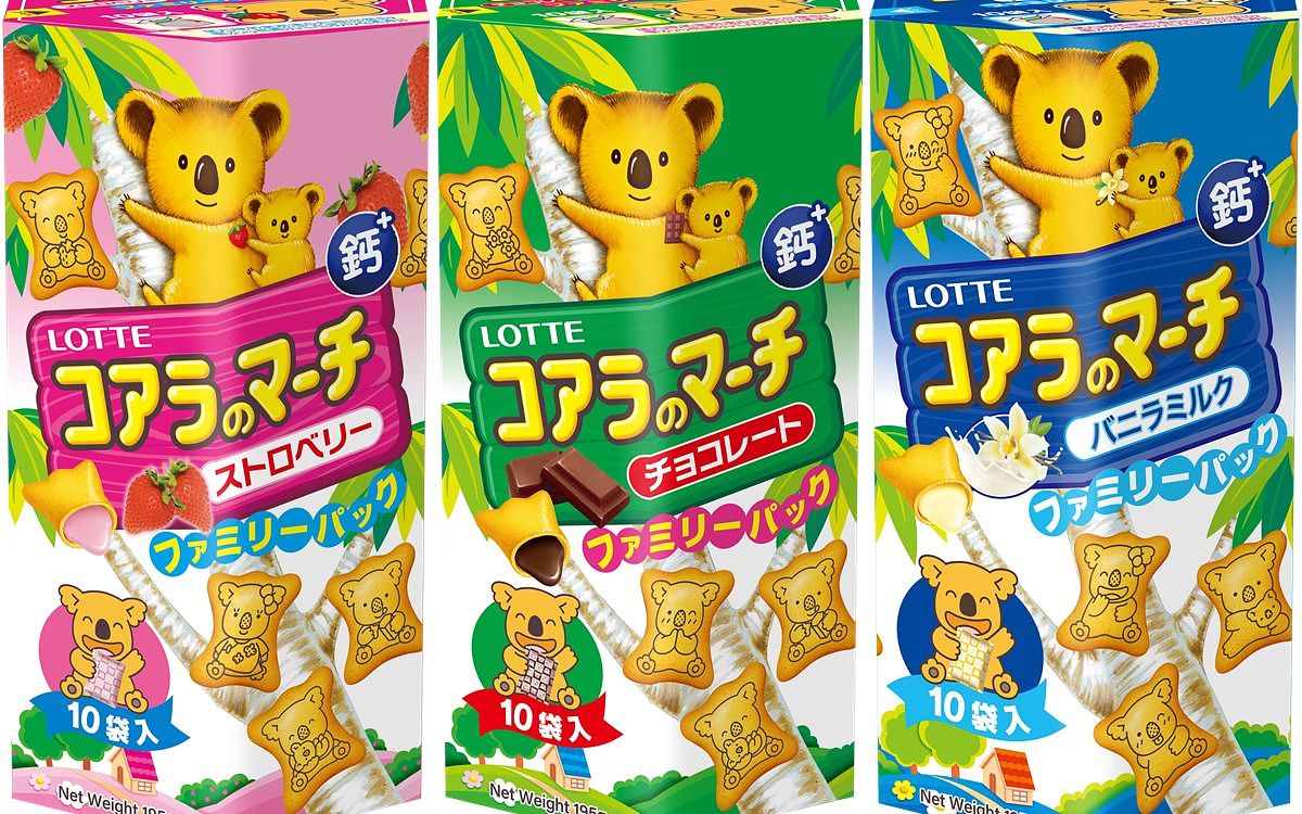 大人小孩都喜歡的樂天小熊餅,1984於日本誕生,當時澳洲計畫送日本兩隻無尾熊,開發人員們立刻受到了啟發,於是決定要設計出以無尾熊為範本的卡通人物,並且立定了要將這個無尾熊卡通人物印在餅乾上的企劃,同時結合空心餅乾技術、推出小熊餅乾,並取名「コアラのマーチ」,「像可愛的遊行吹奏樂團(Marching Band)一樣,今後也會有很多無尾熊陸續地來到日本」這樣快樂的景象為靈感,因此決定使用「Koala no March(無尾熊大遊行)」這個名字。而樂天小熊餅獨特的六角柱型紙盒包裝,其實也是以無尾熊最喜歡的尤加利樹為靈感所設計出的造型。