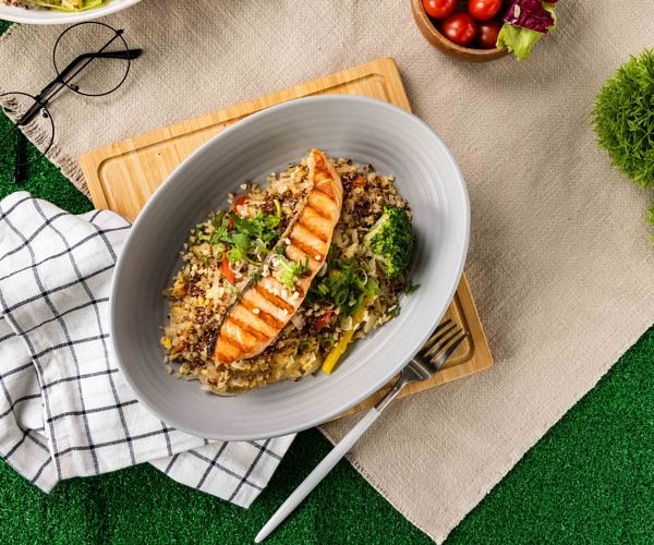 歐美健身圈瘋吃、完全零澱粉的「嫩烤鮭魚菲力白花椰米」(定價348元),將健康無負擔的白花椰米、杏仁角取代米飯增添口感層次,等於以膳食纖維代替澱粉(碳水化合物),再以厚切嫩烤鮭魚菲力、紅藜麥、紅黃椒、雞蛋等多種鮮美食材盡收一盤,新鮮嫩鮭佐營養時蔬互襯鮮甜,熱量比米飯少一半的白花椰米吃來飽足、味香迷人,喜愛運動健身或重視體態的纖女,絕不容錯過這道清新健康的低醣「偽炒飯」!