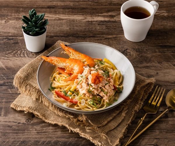 「奶油明太子海鮮義大利麵」(定價268元),以歐洲進口橄欖油翻炒蒜頭、洋蔥添香,再加入紅、黃甜椒,佐上義式經典香草醬融合鮮奶油、帕馬森起司以及日本進口明太子,與滑順麵條Q彈入味,搭配滿滿手撕鮭魚、鮮蝦,濃郁奶香略帶鹹辣,咀嚼之間、嗶嗶啵啵鮮味綻放,誘人一試難忘!