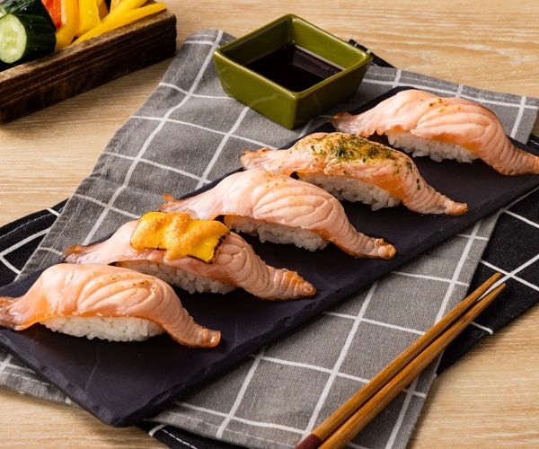 「炙燒三味鮭魚握壽司」(原味、明太子起司、焦糖海苔)(定價268元),將挪威直送的生食級新鮮鮭魚佐焦糖炙燒,綴上海苔粉,咬下金黃微焦的外層,入口卡滋卡滋,另將鮮嫩鮭魚與金黃起司、明太子美乃滋交織共舞,嫩、鮮、甜的多重美味令人回味再三!
