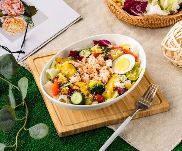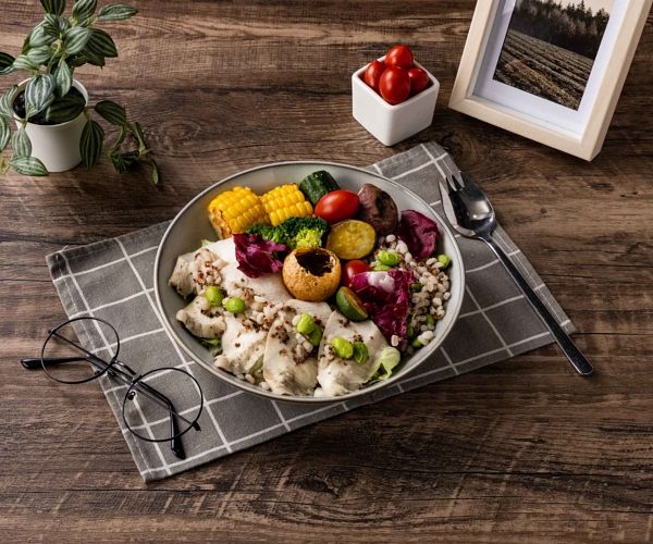 圖片來源:美威鮭魚 首次將餐點加入第二優質蛋白選項-「雞肉」,為消費者提供多元、健康的選擇,包括提供消費者非鮭魚選擇的「義式香草舒肥雞沙拉」(定價278元),主廚特將鮮嫩雞胸肉佐以義式香草醬汁,再運用法式舒肥低溫烹調方式慢煮,成就柔嫩不柴的紋理,搭配多種彩蔬、以及高纖高蛋白的紅藜麥、大麥仁、毛豆仁,淋上一口裝在印度脆球的檸檬油醋淡雅入味,亦可搗碎脆球享用增添口感層次,令人胃口大開!