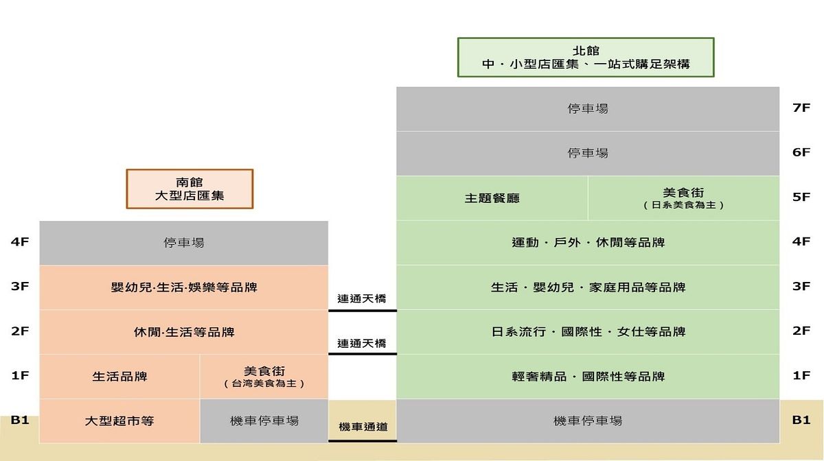 南北館店鋪面積超過2萬坪,空間寬廣舒適且明亮,除了滿足購物需求,也很適合親子家庭在此享受一整天悠閒時光。「南館」以大型店鋪為主,包含日系超市、品牌服飾、生活用品大店等;「北館」則聚集中小型品牌,兩館都有最受歡迎的美食街,南館主打異國美食,北館則以日系料理為主!