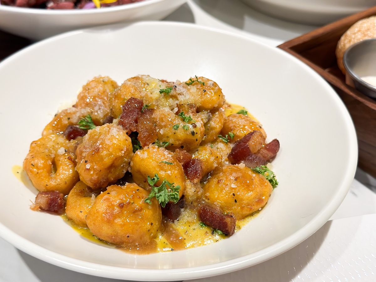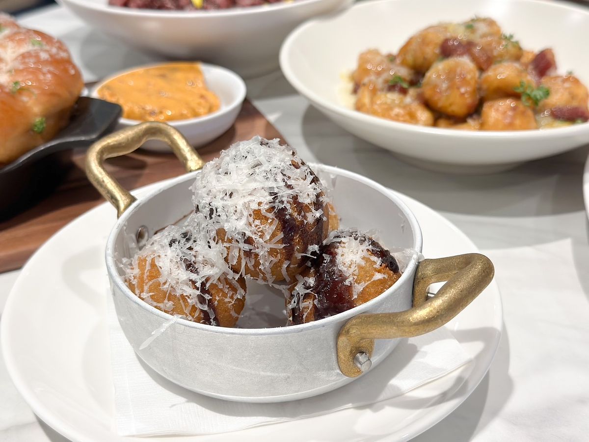 會有這道菜色的由來很有趣,只是因為主廚Timothy在台灣,有一次朋友在餐廳點了一道炸饅頭,配上煉乳覺得很好吃,於是引起他創作的好奇心,Pasta&Co是以麵粉作為餐廳主菜的主軸,於是以這個概念來做為引子,將麵粉揉成一顆顆小饅頭,有點像麵疙撘,將他們入鍋油炸撈起,接著以培根、胡椒粉、蛋黃、grana padano起士一起拌勻再放入炸饅頭,最後再撒上百年品牌CARANDINI的帕瑪森義大利起士醬,充滿Creaming的一道料理,所以主廚加上很多Balsamico酒醋,讓口中過於奶油膩的口感中和一下。