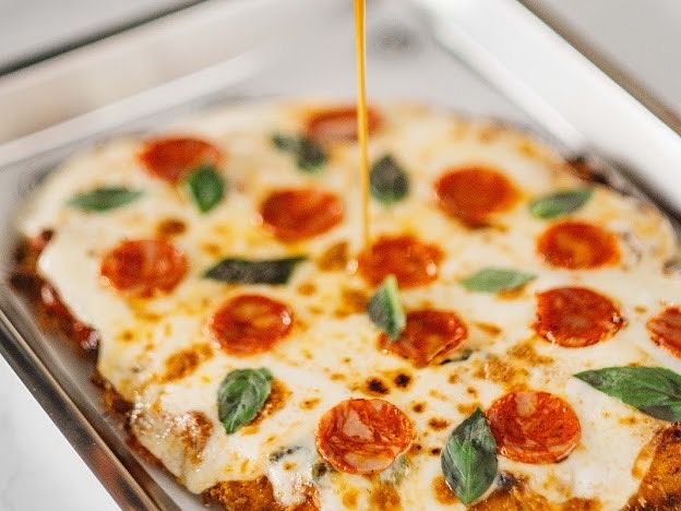 這道菜色在美國相當有名,主廚想分享給台灣朋友們。雞胸肉裹粉加入白酒醃漬後,再放入白里香、蛋汁、日式麵粉,披薩的麵粉烤盤上,雞胸肉擺上,一定要加上老乾媽番茄醬,以及些許Arrabbiata 辣味醬,撒些九層塔,鋪上薄片的Smoked mozzarella,辣味西班牙Salami等,焗烤後,淋上初榨橄欖油。並附上辣味蜂蜜醬(hot honey)可以搭配,用手扒、大口咬下最是對味又豪邁!