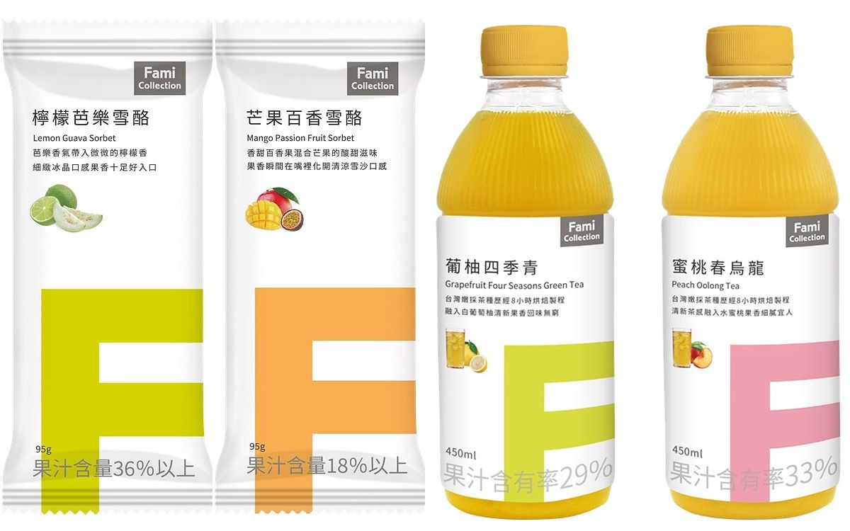 「全家」自有品牌向來帶給消費者清新自然的印象,近期品牌名由「FamilyMart Collection」正式更名為更朗朗上口的「FamiCollection」(簡稱FMC),同時以象徵「好吃、好玩、新鮮、時髦」的品牌特色為設計,將大寫的「F」字母套上符合商品的色調呈現於包裝,陸續為自有品牌商品換上新裝,清新明亮的全新設計,讓消費者一眼就感受到FMC商品的FUN、FREE、FANCY以及FRESH。除既有商品換上清爽新裝之外,「全家」也陸續推出適合夏季享用的清爽新品,有別於市售常溫飲品果汁含量大多為10%以下,FMC葡柚四季青、蜜桃春烏龍分別添加29%及33%果汁,並選用南投松柏嶺嫩採茶菁,一飲入喉,茶香、果香優雅綻放,即日起至5/30,兩款果茶新品任選2件特價55元(原價39/瓶)。嚴選在地食材製成的FMC雪酪冰棒也含有豐富果汁含量,芒果百香雪酪含有18%以上,檸檬芭樂雪酪更高達36%以上,每一口都能感受到酸甜果香四溢,且雪酪口感細緻,直到最後一口都暢快清涼;新品原價每件40元,5/30前「全家」會員享加10元多1件優惠。