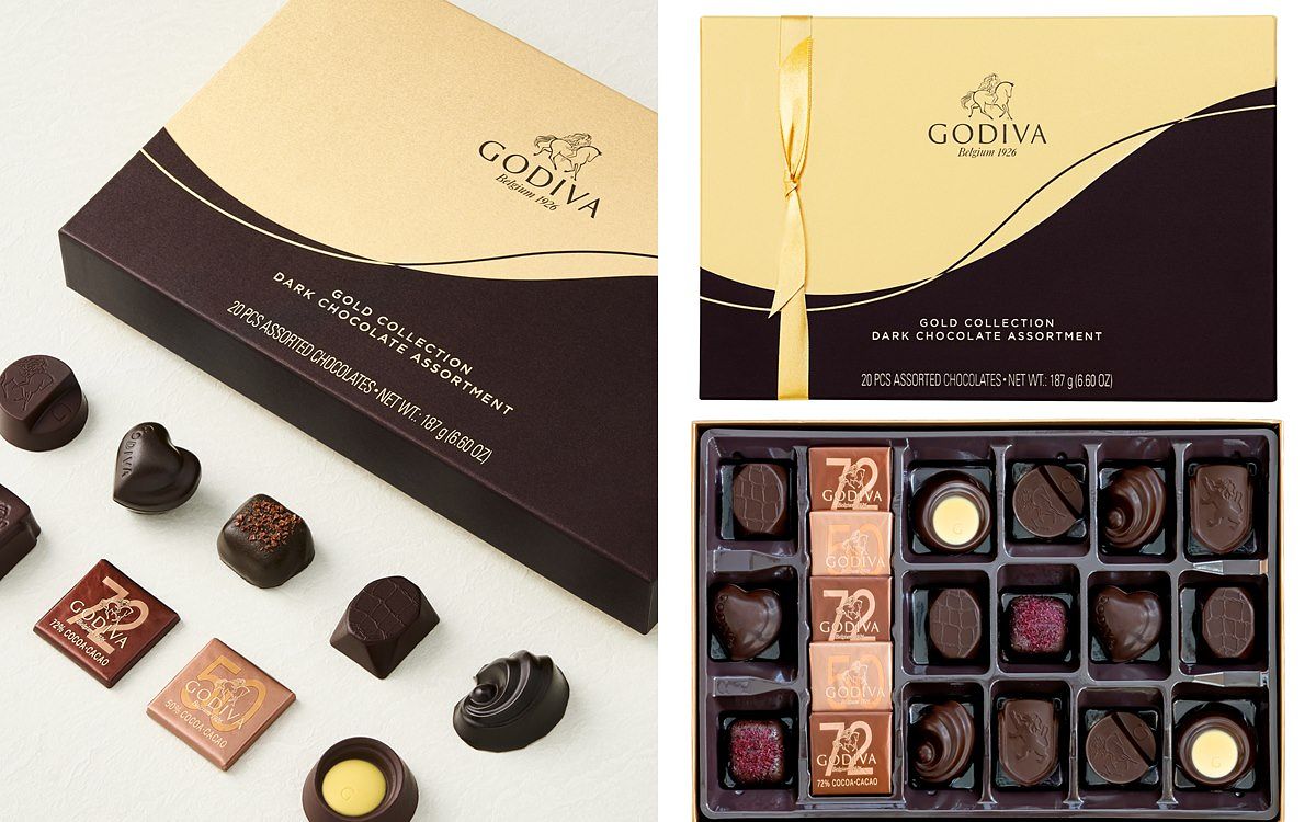 由多款黑巧克力為基底的GODIVA經典夾心巧克力所組成,金裝黑巧克力禮盒就像一個充滿故事的傳奇寶盒,將多重味蕾體驗賦予醉人的巧克力中!融合多種受人喜愛的元素:巧克力醬、果仁蓉、焦糖、香草及咖啡、花果香,每一款都擁有無可比擬的口味和特質,每一顆不僅是由巧克力大師精心設計,更有著代表性的涵義與味蕾體驗等你來發掘!