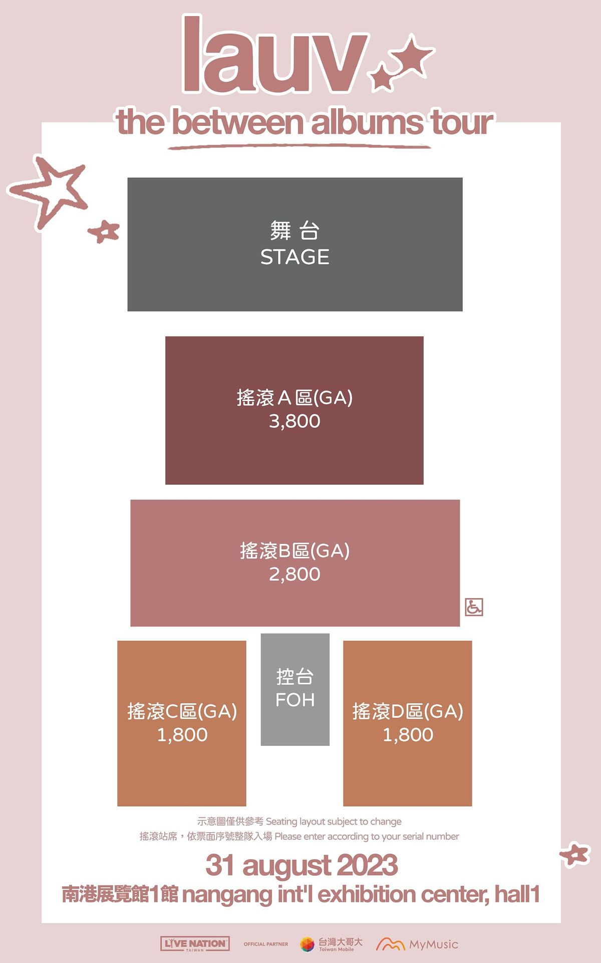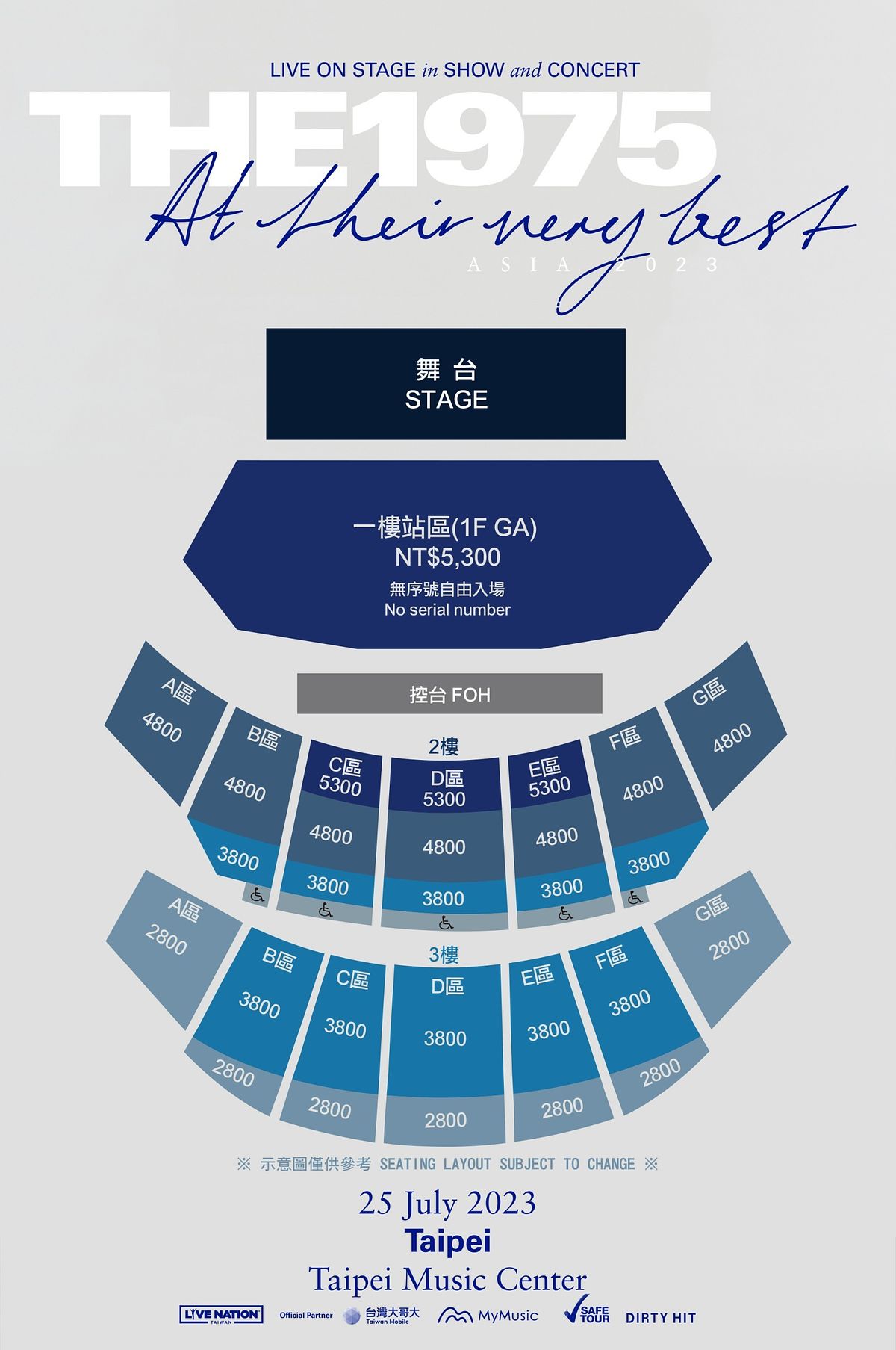 票價:搖滾站席NT$5,300/ 座位區NT$5,300 / 4,800 / 3,800 / 2,800 (劃位座席,請依票面座位號入座)