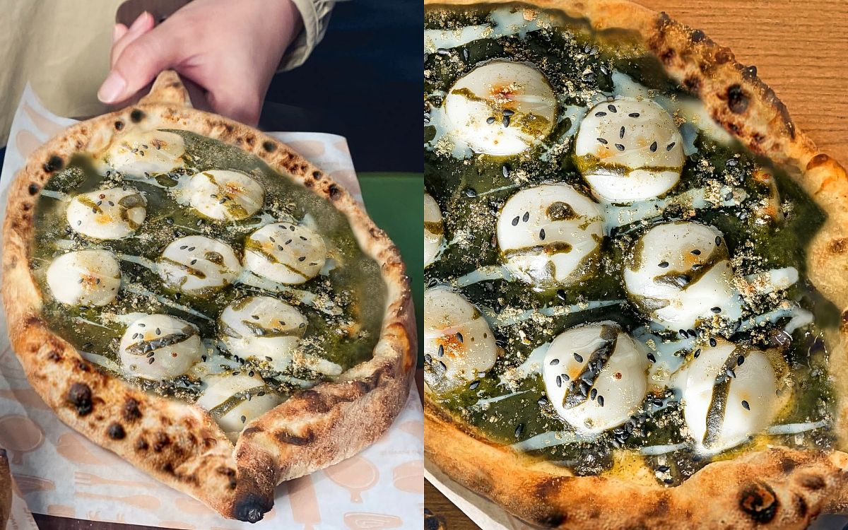 比薩上佈滿客家傳統麻糬,在口中細細咀嚼糯米香氣,尾韻散發自然甜味,搭配擂茶醬、煉乳、黑芝麻、起司絲,越嚼越香,甜而不膩,一口一口難以停下的美味。