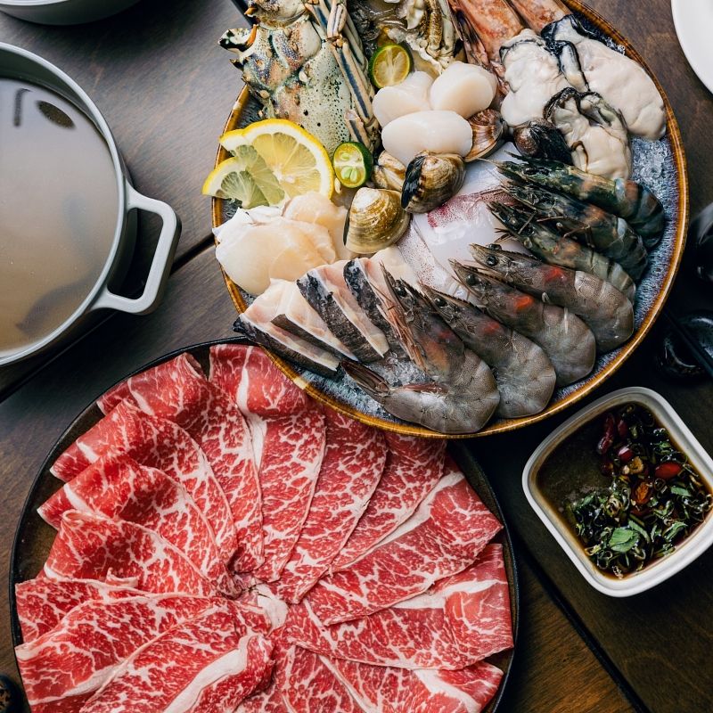 《山家清供》南宋食譜書中的「撥霞供」是目前史料最早火鍋涮肉的記載:撥是描述涮涮的動作、霞是兔肉如晚霞的顏色深紅帶紫、供是指供食、提供,將肉片在滾燙的湯中左右擺動到對的熟度,就可以開動品嚐。肉大人的涮火鍋選項提供近十種肉類以及十種海鮮,從台灣雲林究好豬帶皮豬五花、伊比利豬肉松阪、美國無骨牛小排、澳洲羊梅花、澳洲 M8 和牛、到富豪美食排行榜上的日本尾崎和牛,採用火鍋肉片中精選中的精選,每日提供的肉片厚薄會依據其肥瘦品質做些許調整,除了「涮」還有「煮」、「燙」、「沖」,品嚐肉片時,火鍋湯頭須維持沸騰狀態,豬肉適合放入湯中久煮,海鮮魚片蝦等適合以湯勺裝著燙、時間不宜過長,和牛則適合將其放入碗中,以從鍋中舀起的沸騰湯頭沖下,想要吃到軟嫩好吃的肉,樂趣和秘密就在這些講究的方式中。肉類除了火鍋肉片,肉大人的紅蘿蔔肉燥飯,也是值得一試的美味肉料理。