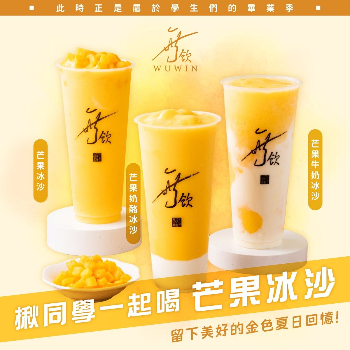 六月不知不覺地到來,各地學校響起驪歌,此時正是屬於學生們的畢業季啦!不管是即將進入職場,或是邁入下一階段,都要與相處多年的同學們揮揮手,迎向嶄新的未來!而在畢業之際,相揪同學們來喝無飲!喝最符合這個時節的芒果冰沙吧!「芒果冰沙」、「芒果牛奶冰沙」、「芒果奶酪冰沙」選無飲這三款清爽、順口、好喝的芒果系列飲品,一起留下美好的金色夏日回憶。