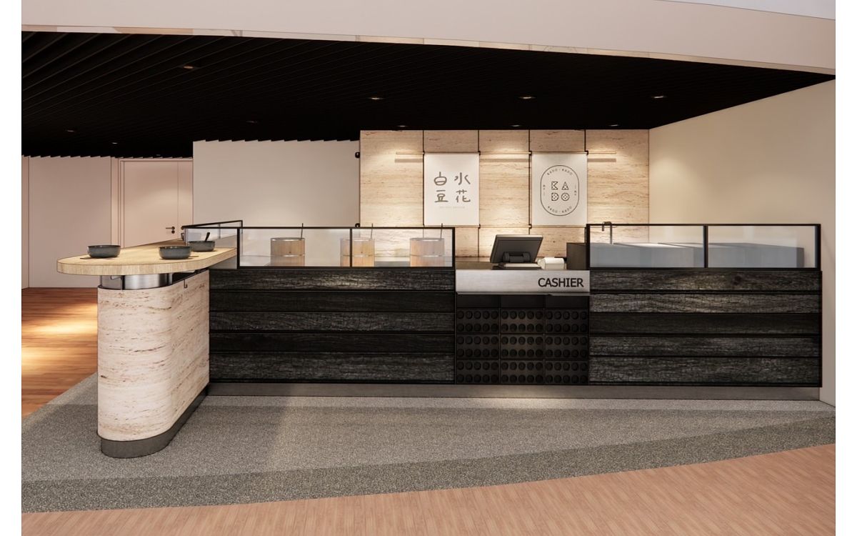 深受文青喜愛的白水豆花,除礁溪店及永康街店之外,現在與創意造型雞蛋糕KADOKADO首次獨家聯名,斥資在101百貨89樓觀景台,打造全台最高立食區,櫃位裝潢以黑色的燒杉來代表製作雞蛋糕的熱能,類似泉水川滴的洞石板代表白水豆花煮豆漿使用的天然水經過山脈岩層過濾,天然純淨,富含大地養分;更富趣味的是將台灣傳統雞蛋糕模具加工成點單的菜單,讓國內外旅客近距離接觸,點單的時候能體驗烤雞蛋糕翻轉模具的感覺。