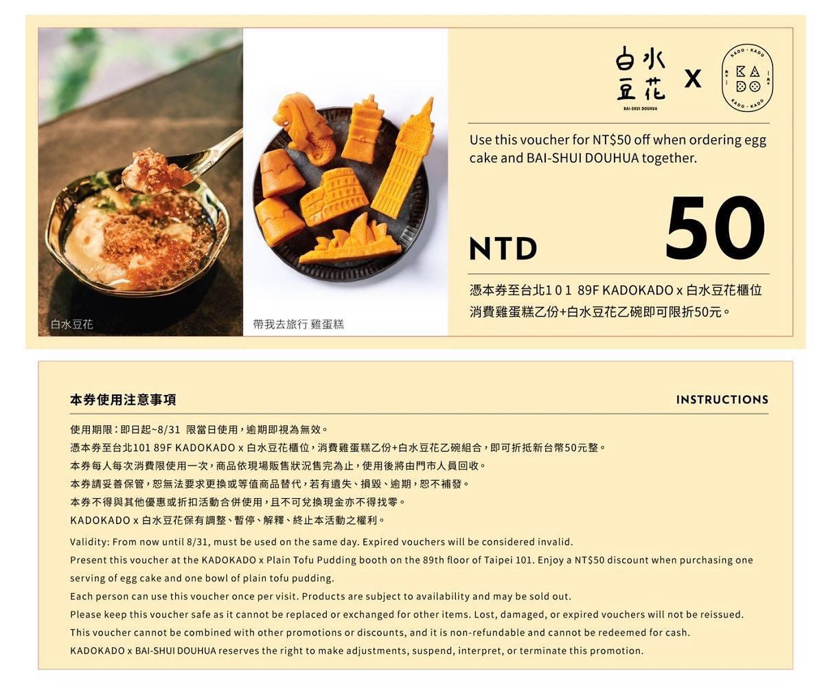 文青國宴白水豆花與創意造型雞蛋糕KADOKADO唯一獨家聯名櫃,白水豆花x KADOKADO 101獨家聯名高空店,7月1日起於101百貨89樓觀景台正式登場,斥資打造全台最高立食區,自7/1日起至8/31日憑購買觀景台門票附贈的折價券,消費白水豆花1碗和一份KADOKADO雞蛋糕可現折50元,每天限量1000張,送完為止。