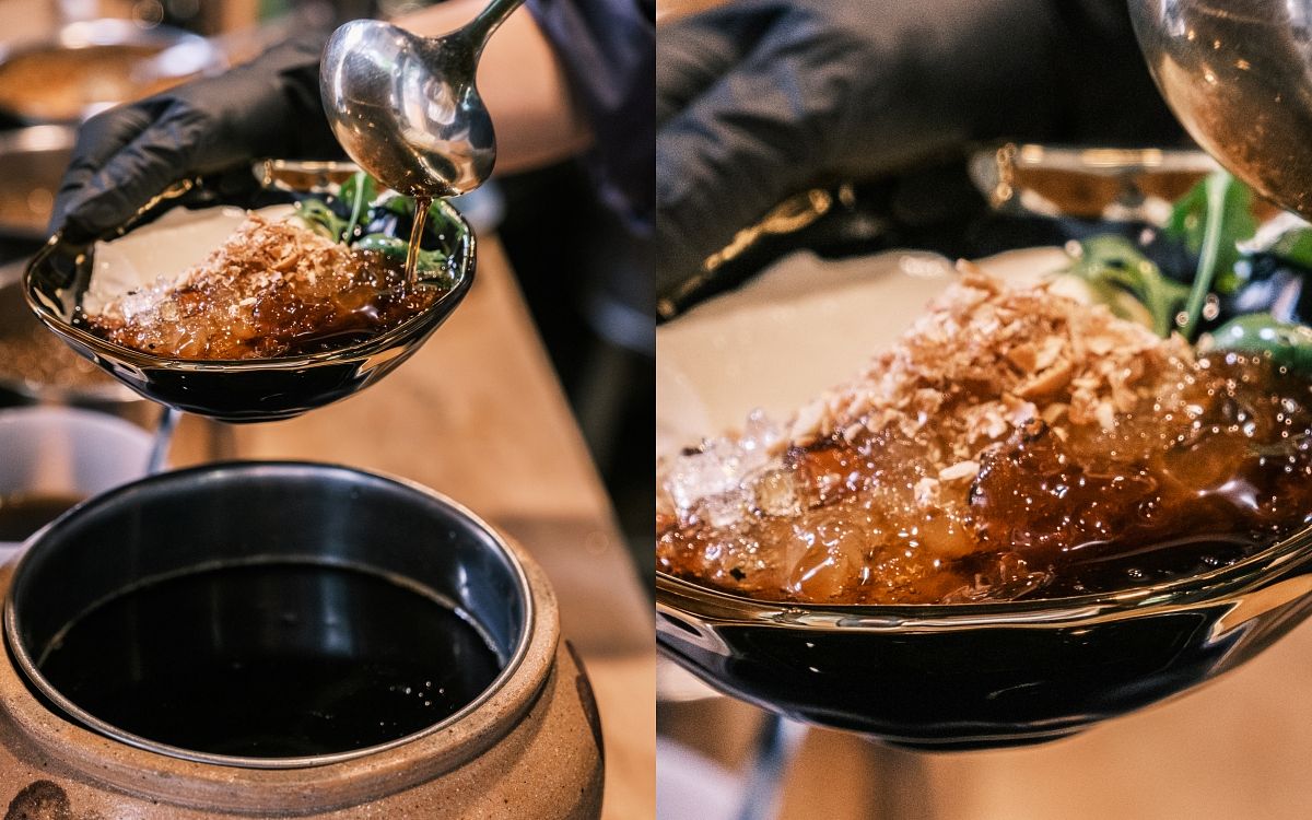白水豆花使用宜蘭雪山新鮮湧泉製作,遵循古法直火煮漿,豆香味甘甜,掌握精緻濃度與溫度,加入東岸太平洋深層海水作為天然凝固劑,融合山與海的微量元素,做成一碗香滑嫩彈的白水豆花。