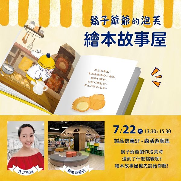 「鬍子爺爺的泡芙」繪本暖身活動第二波,將於7/22舉辦「繪本故事屋」活動,特別邀請了充滿活力熱情、現場主持說唱經驗豐富的先芝姐姐來說繪本故事,分享爺爺做出美味泡芙的過程,讓粉絲們對鬍子爺爺有更多認識!當天活動現場還有販售繪本,數量有限售完為止!