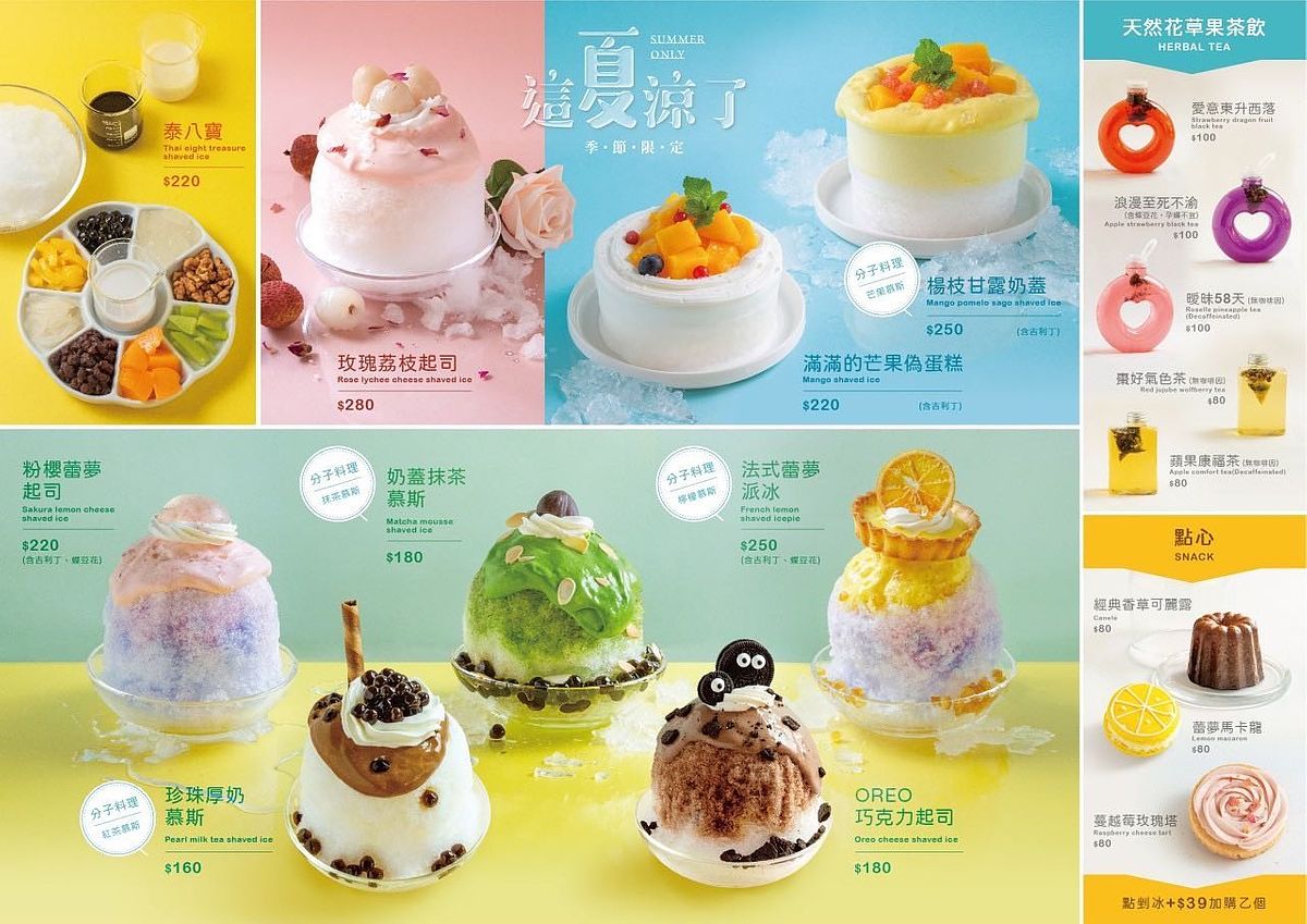 店內最熱銷的剉冰就是-奶蓋抹茶慕斯,淋在上面的抹茶慕斯可不是一般的抹茶慕斯喔!它可是「分子料理抹茶慕斯」,將常在米其林星級餐點中聽到的分子料理技術運用到冰品上,製作出一種很輕、很綿、入口即化,不膩的鮮奶油口感,讓抹茶慕斯吃起來特別的濃郁與綿密,再搭配上蜜紅豆和糖漬栗子,是款頗具日式風味的人氣剉冰!