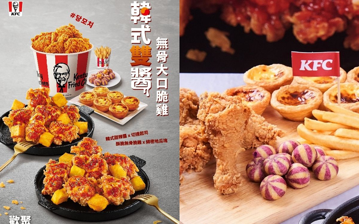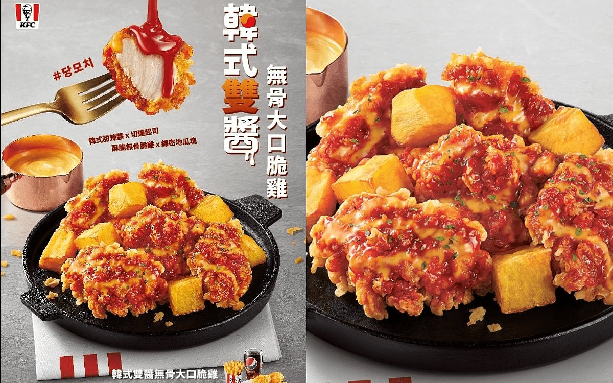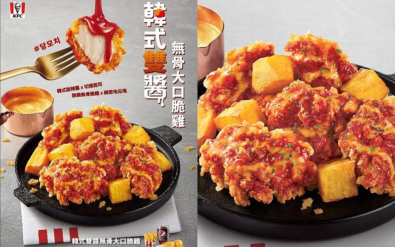 肯德基「韓式雙醬無骨大口脆雞」韓式甜辣醬+黃金切達起司醬,搭配台農57號黃金地瓜塊太誘人