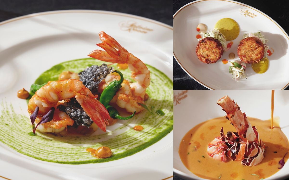 圖片來源:台北喜來登夏季新前菜共有八種選擇,以雞尾酒蝦、蟹肉餅及炸虎蝦三款最具特色,「雞尾酒蝦 NT$680」為常見的西式開胃菜,新鮮白蝦沾上辣椒醬、檸檬汁、香料等特製醬料,酸辣開胃。美東馬里蘭州名菜「蟹肉餅 NT$580」,手工精挑新鮮藍蟹肉混和洋蔥煎炸,搭配柳橙蛋黃醬、自製辣椒油與彩椒丁,鮮辣夏日風情。「炸虎蝦 NT$480」選用台灣黑虎蝦裹粉酥炸,搭配西谷米脆片與墨西哥莎莎醬,以青蔥醬畫盤點綴哈里薩辣醬,初嚐香辣帶勁、尾韻檸檬與蒜香接踵而至。湯品延續安東廳傳統的「干邑風味龍蝦湯 NT$880」、口感改良為順滑細綢的「蘑菇卡布奇諾湯」以及選用帕達諾、莫札瑞拉及瑞士葛瑞爾三種起司與薄脆吐司的「焗烤洋蔥湯 NT$250」,另有讓人耳目一新「雞肉澄清湯」,以法式清湯為底,加入自製雞肉丸與自製蝦餃,為夏季捎來一絲清爽。