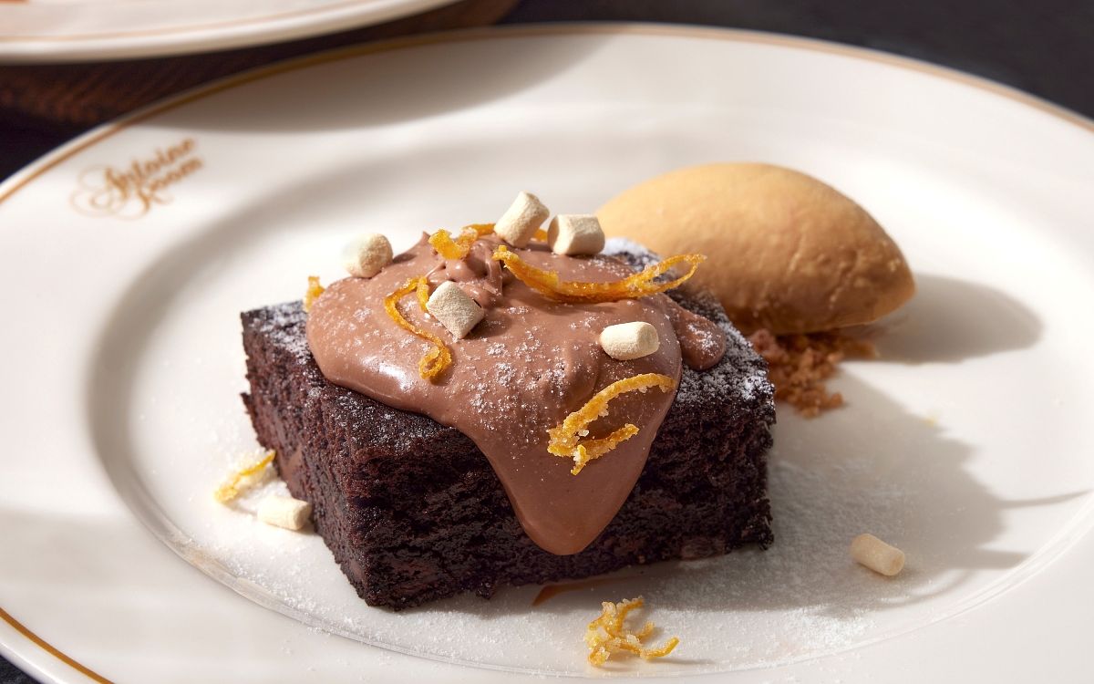 圖片來源:台北喜來登作為結尾的甜點,吳顧問在甜味基礎上增加鹹度以凸顯溫和的甜感,讓賓客味蕾不易疲倦。五款甜點中主廚最推薦「布朗尼 NT$350」,選用85%的黑巧克力製成濕軟布朗尼,上層是伯爵茶甘納許搭配蜜漬橙絲,佐配味噌冰淇淋,濃醇巧克力味中茶香陣陣,奶香帶出味噌甘醇味道,絕佳的鹹甜搭配。另一款「法國白桃水果雪酪」選用帶有細膩香氣的法國進口白桃與新鮮無花果,稍以炙燒激發香濃果味,搭配入口即化的自製莓果雪酪,多汁甜香與酸甜莓果感受夏涼之味。