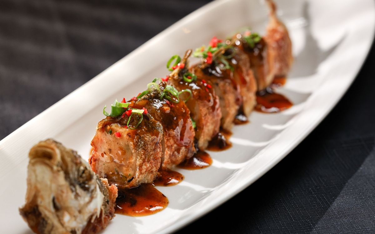 圖片來源:晶華酒店另一道功夫菜古法煎鑲鯪魚,因為食材取得不易,在臺灣各大餐廳中並不常見,主廚這次透過熟客介紹取得稀有的野生水庫鯪魚,因為鯪魚多刺,料理前的去骨剔刺工作就非常的不省心,之後還要細心的將魚肉和魚皮拆開,留下完整的魚皮,接著將魚肉跟明蝦手工剁成茸後,加入老陳皮絲、鹽、胡椒粉打至「出膠」,接續加入切碎的香菜、蔥、冬菇粒,火腿粒,與生粉拌勻後鑲回魚皮中,最後以慢火煎至外皮金黃香脆並再淋上用生抽、豆豉加蠔油調製的上湯芡,一道精緻美味的經典粵式名菜即成。