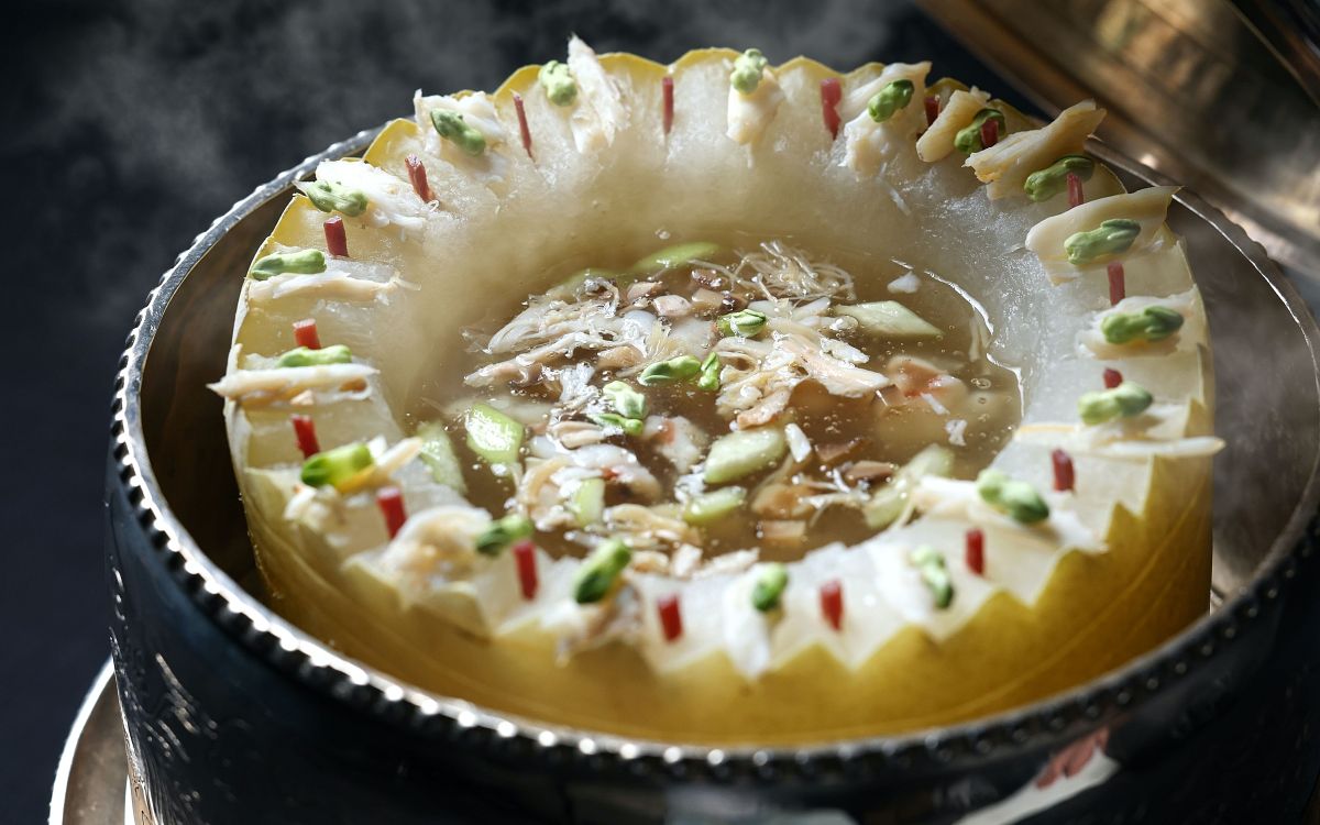 圖片來源:晶華酒店列在功夫菜類單元中的八寶冬瓜盅是道經典手工粵菜,據傳冬瓜盅最早的起源來自清宮御菜「西瓜盅」,後傳到盛產冬瓜的廣東,便改以冬瓜為器皿,取名為「冬瓜盅」。鄔主廚將悉心雕刻後的精美冬瓜抹上少許鹽和紹興酒提味,放入蒸箱蒸熟後填入粵菜獨有的上湯、以及為湯品注入鮮味的蟹肉、干貝、明蝦、花菇、瑤柱、田雞、火腿等八款珍寶一同燉煮,冬瓜和食材的香氣經過沸騰的湯汁,滋味交融相輔相成,上桌前主廚會畫龍點睛的在冬瓜盅上綴以香氣迷人的夜香花,並以大氣高雅的純銀器皿盛裝,一道外觀尊貴華麗,細品起來清香撲鼻、紳士溫順的冬瓜盅即大功告成。