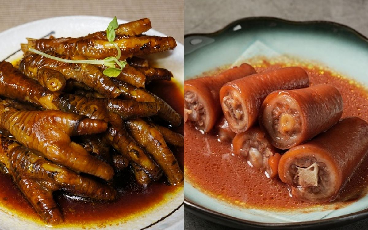 「打冷」為潮粵佳餚的風味之首,更是大排檔中的精華之一,「鮑汁鳳爪 NT$280」將鳳爪川燙去腥,以鮮美的金華火腿、鮑魚等頂級食材熬煮提煉醬汁後泡滷,軟嫩又不失鳳爪獨特的彈性,富含膠質及油亮的精華色澤,是「潮品集」向來的人氣明星商品。「紅麴豬尾巴 NT$580」以精華上湯燉煮豬尾巴一個小時後,再以紅麴入味,提升香氣外,還能降低豬肉的油膩感。