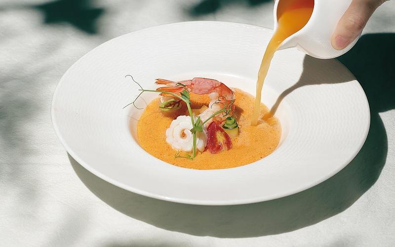 「夏慕尼」跨界保養品牌「歐舒丹」為今年七夕情人節共同打造「夢幻和牛套餐」,融合歐舒丹品牌經典馬鞭草、杏仁等元素入菜,包含「天使紅蝦海鮮清湯」、「南法松露蕈菇溫沙拉」、海鮮前主餐「北海道干貝佐普羅旺斯香草醬」與「堅果龍虎石斑佐杏仁奶油醬」,重頭戲主餐「香燻澳洲M8和牛佐馬鞭草櫻橘醬」,另有「煙燻伊比利豬佐杏桃酸桔醬」可選擇,餐後還有專屬甜點「戀夏歐舒丹」,杏仁與莓果交織酸甜口感,南法風味完美收尾。
