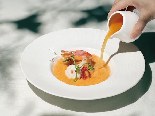 厚實的天使紅蝦沉浸在多樣海鮮及蔬菜熬製而成的湯體中,飽含南法漁夫風的海洋精華。