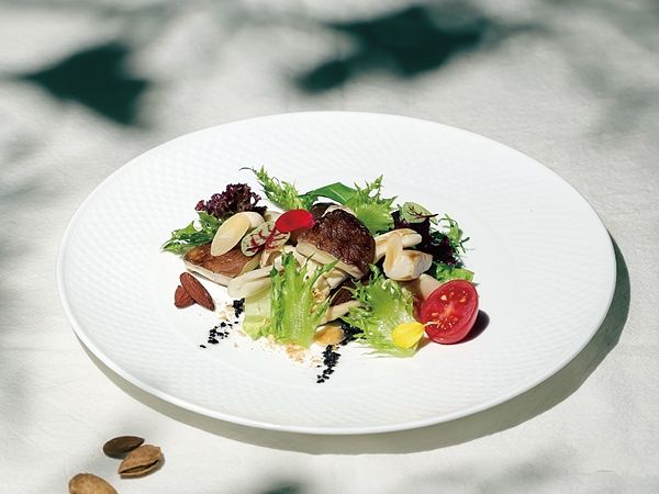 花香醬、黑松露醬拌炒多樣菇類,鋪墊貝比生菜、蘿美,主廚現刨杏仁,堆疊成一座南法香氣森林,口感溫潤順口。