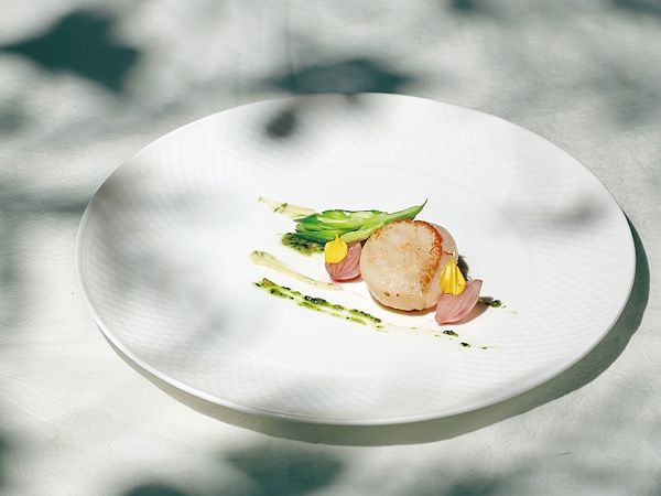 鮮甜的北海道生食級干貝佐以馬鞭草、茵陳蒿、羅勒製成的清新香草醬汁,層次十足、口齒留香;香煎細緻的龍虎石斑,表面覆以香氣十足的堅果碎,搭配杏仁奶油醬,交融出豐富細膩的風味。