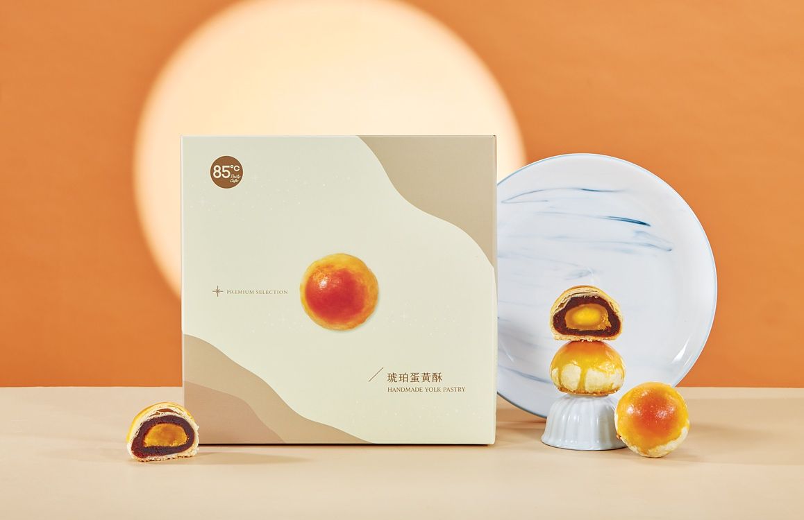 85℃「琥珀蛋黃酥」禮盒由國寶級師傅王振癸研發監製,一盒九入顆顆渾圓晶亮,金黃外皮宛如琥珀般閃耀,特別選用在地小農鹹蛋黃,以天然放牧飼養,鴨蛋蛋黃大而營養,且採用古早紅土醃製方式,醃足23天讓蛋黃完全熟透不死鹹,搭配綿密手工奶油紅豆沙餡,豆沙餡與鹹蛋黃的完美比例,加上層層表皮薄如蟬翼入口即化,底層再以白芝麻酥皮包裹。