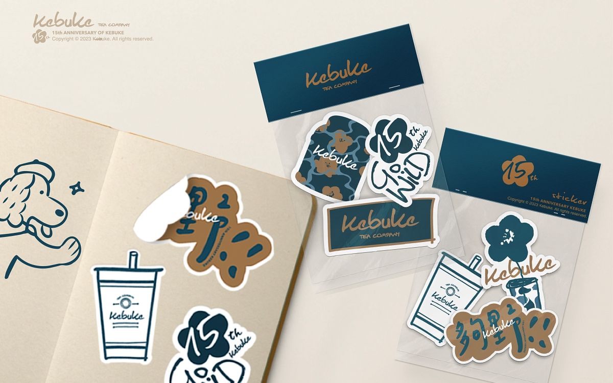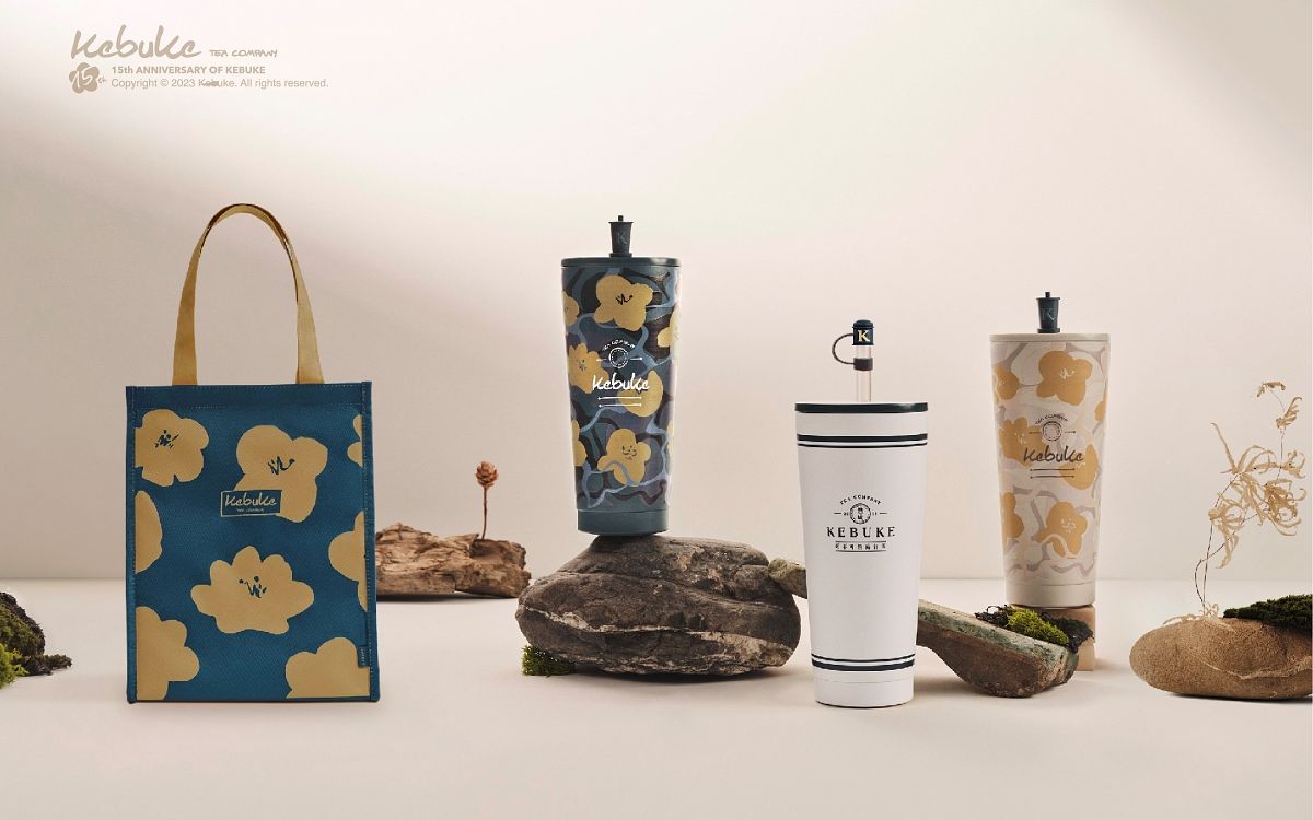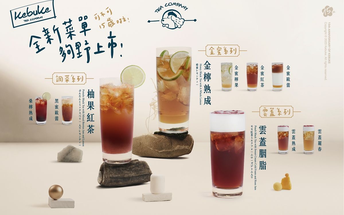 2023 Wait & See 回歸初心大膽作夢!這次以波紋迷彩為十五週年視覺基底,將迷彩意義轉化為茶飲生活軌跡,將可不可LOGO與品牌專屬海棠花圖騰以自然的手繪線條表現,更多了一份溫度,猶如每一天執著做一杯好茶創造好的服務體驗,一點一滴涓注在無垠的茶飲生活之海。