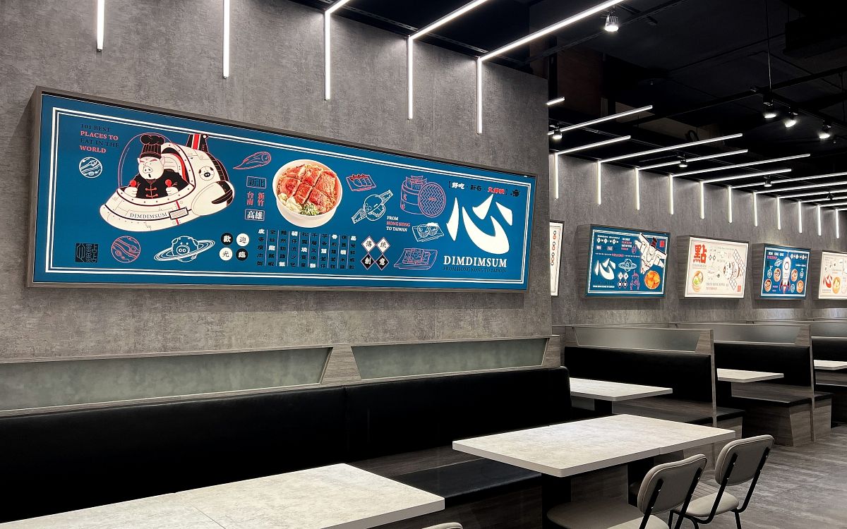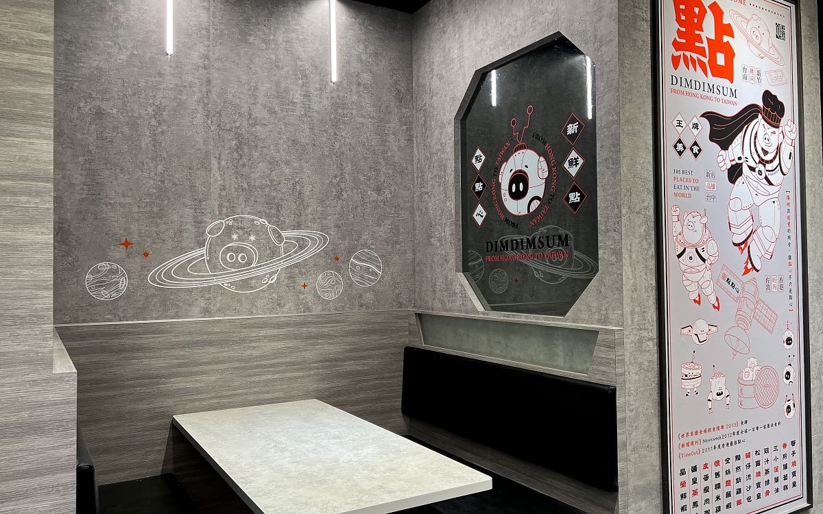 圖片來源:點點心「點點心 新店裕隆城店」全店面積70坪、超過90個客座席次,以新店區及裕隆集團的「科技」產業作為設計靈感,打造第一家太空科技感的全新店型,將點點心辨識度最高的「天花燈箱」改為「牆面燈箱」,加入「LED光線燈條」及「文字跑馬燈」,更調出品牌新色「銀河灰」搭配「宇宙太空藍」,充滿速度與未來感的全新店型,令人眼睛一亮;除此之外,門口的「步入式打卡區」也相當吸睛,有別於其他門市走的是萌系巨型豬仔,這次將化身為「豬仔號火箭砲」與「星際港點星球」,要帶領大家遨遊美味的港點宇宙!
