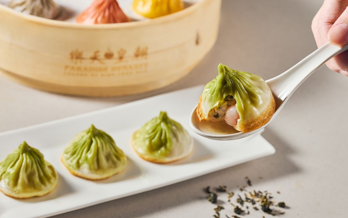 樂天皇朝不斷為台灣小籠包市場帶來新意,除了單籠可享蟹粉、鵝肝、起司等8種風味的八色小籠包,此次為了裕隆城誠品生活分店開幕,量身訂做新口味,將新店茶文化特色灌注小籠包,主廚特別選以代表新店區特色的包種茶結合小籠包與生煎包概念,推出全新限定「脆皮包種鮮蝦小籠包」。以天然菠菜汁揉製成漸層綠色麵皮,藉以在視覺上體現茶葉印象,內餡則以沖泡後的包種茶製成茶凍,再包進豬絞肉與鮮蝦內餡,師傅們手工捏摺、入蒸籠,還得在小籠包底層稍微沾裹麵糊煎炸,擁有脆皮底層的脆皮包種鮮蝦小籠包,罕見地脆口迷人,內餡潺潺流下的茶香氣息爆發,混合著豬肉脂味的茶湯風味甘潤不澀,引領著飽滿內餡展現豐盈鮮美。