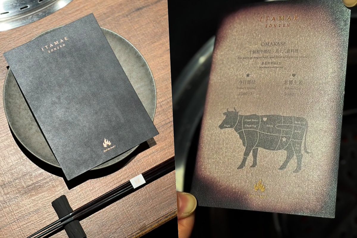 「板前中山ITAMAE ZONZEN」現階段僅供和牛套餐,融入「Omakase」無菜單的概念,可再搭配額外單點。以A5日本和牛為核心主角,嚴選10個肉品部位、與北海道直送海鮮為主,打造共18道餐點的套餐組合。有別「燒肉中山」多元種類肉品組合的套餐選擇,板前中山則是專注在和牛的肉質表現與口感。