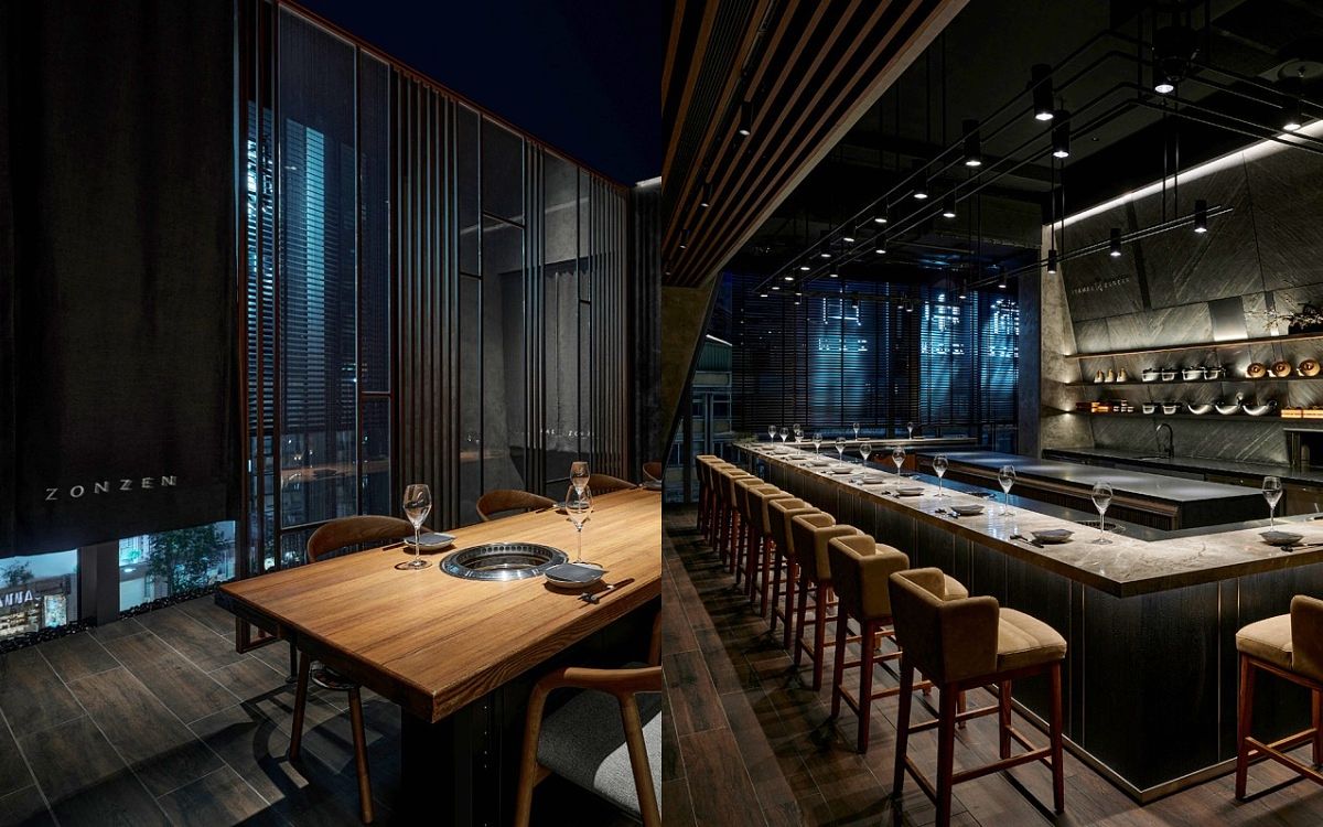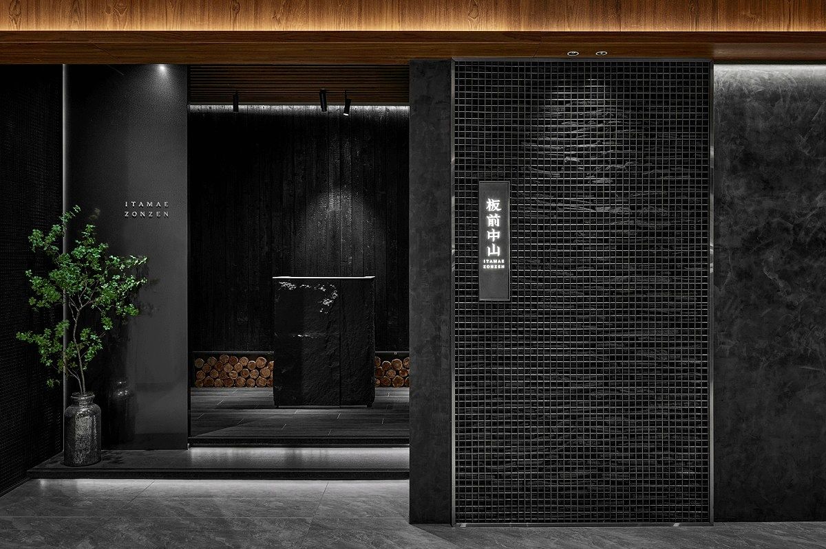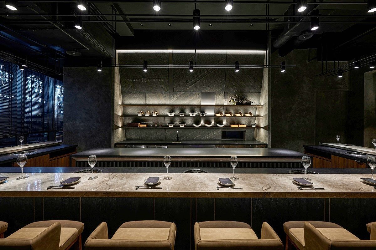 「板前中山ITAMAE ZONZEN」餐廳空間時尚靜謐,設計成板前座位區、桌席座位區,及包廂席位區共三個區塊。沉穩高質感風格的店裝,以大量深色材質為基調堆疊,並以木紋飾出溫潤的用餐氛圍。ㄇ字型的「板前座位區」一共16個席位,以斑駁的大理石桌面打亮整體空間,搭配嵌入自日本進口的烤爐,用餐者可以看到中島料理台上廚師備料過程,沉浸式體驗餐點經過細心燒烤的每個細節。