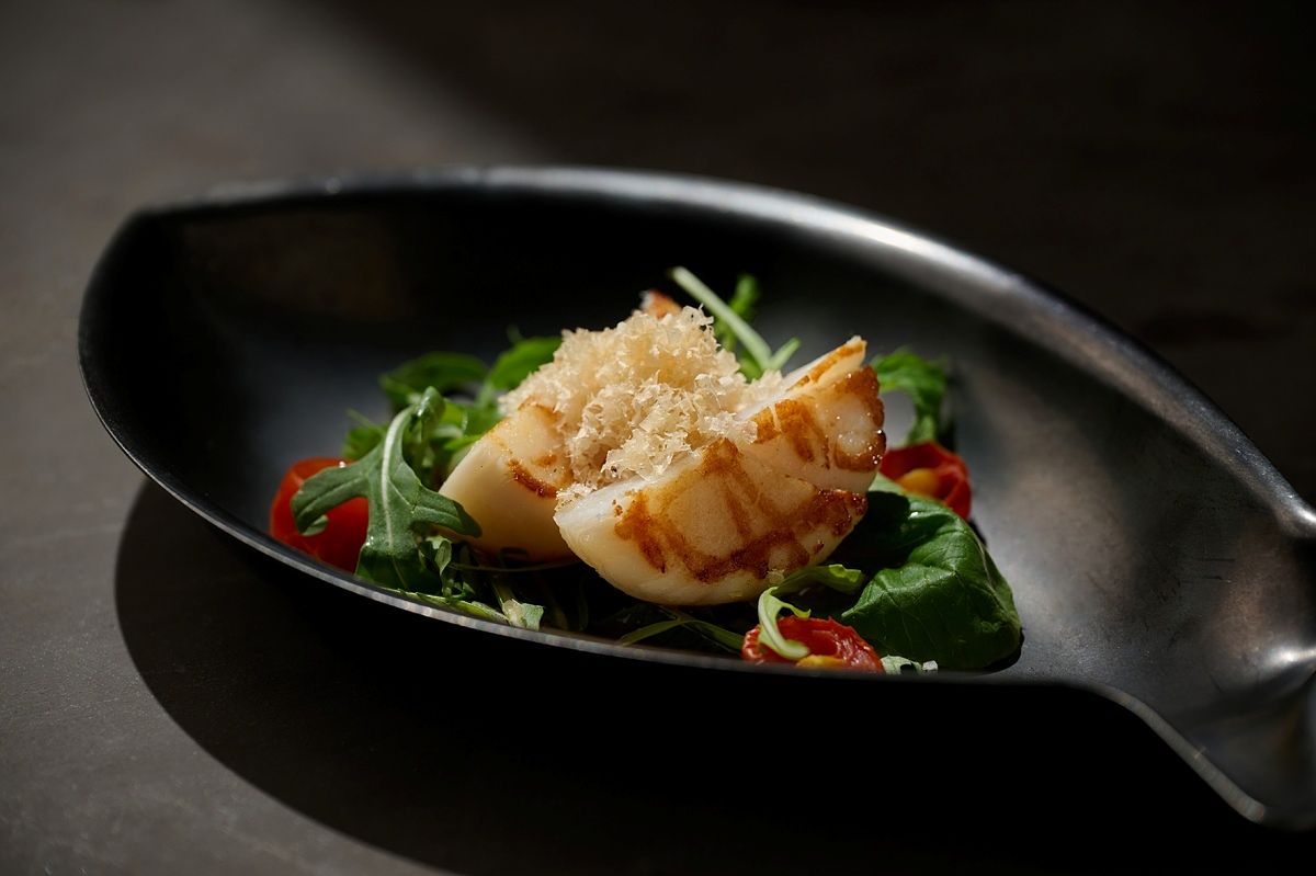 盛裝肉品的餐具選自成立於1955年的日本品牌「AOYOSHI青芳製造所」,不鏽鋼餐具透過拋光技術將其打磨出如同歲月般、仿舊又細膩的痕跡,搭配具溫潤感窯變紋理的陶瓷,透過這些自然質樸的餐具,盛裝創新又奢華的菜餚。