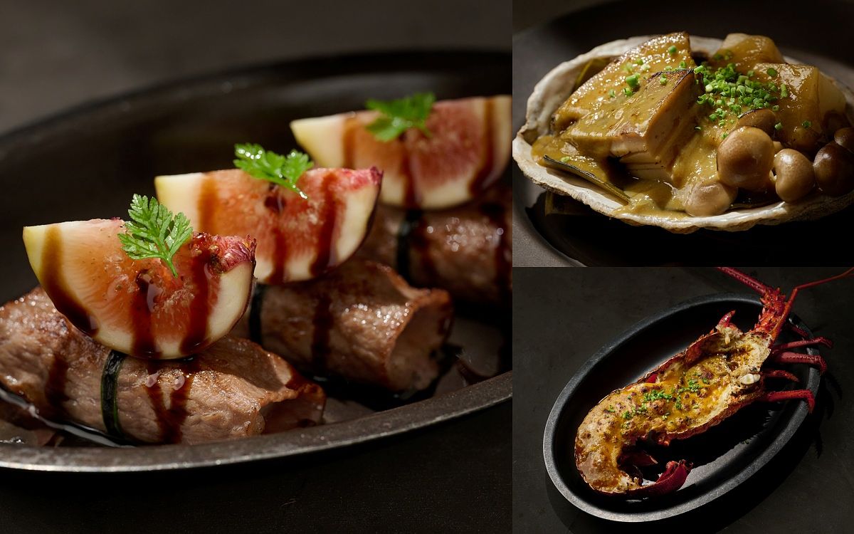 左:和牛紐約客 · 鴨肝 380元 / 右上:南非鮑魚 · 蟹膏味噌 380元 / 右下:澳洲龍蝦‧雲丹 1,380元