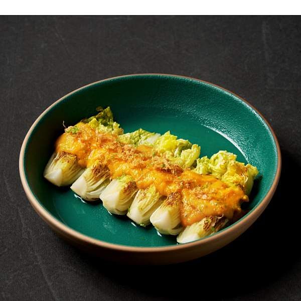 圖片來源:foldie蔬食餐酒館 清爽系前菜「干貝金湯娃娃菜」靈感來自國宴級川菜「開水白菜」,將娃娃菜佐以胡蘿蔔和素奶油調製的醬汁,將娃娃菜甜味提升到另個層次,在吃完重口味的菜色後來上一口,解膩又讓人驚艷。