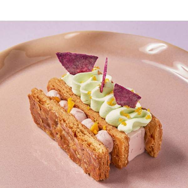 圖片來源:foldie蔬食餐酒館 「金沙斑斕芋泥千層」經過無數次測試才做出的香酥千層餅皮,夾著香氣十足的芋泥冰淇淋和斑斕奶油,口感不厚重卻會讓人幸福感爆棚。
