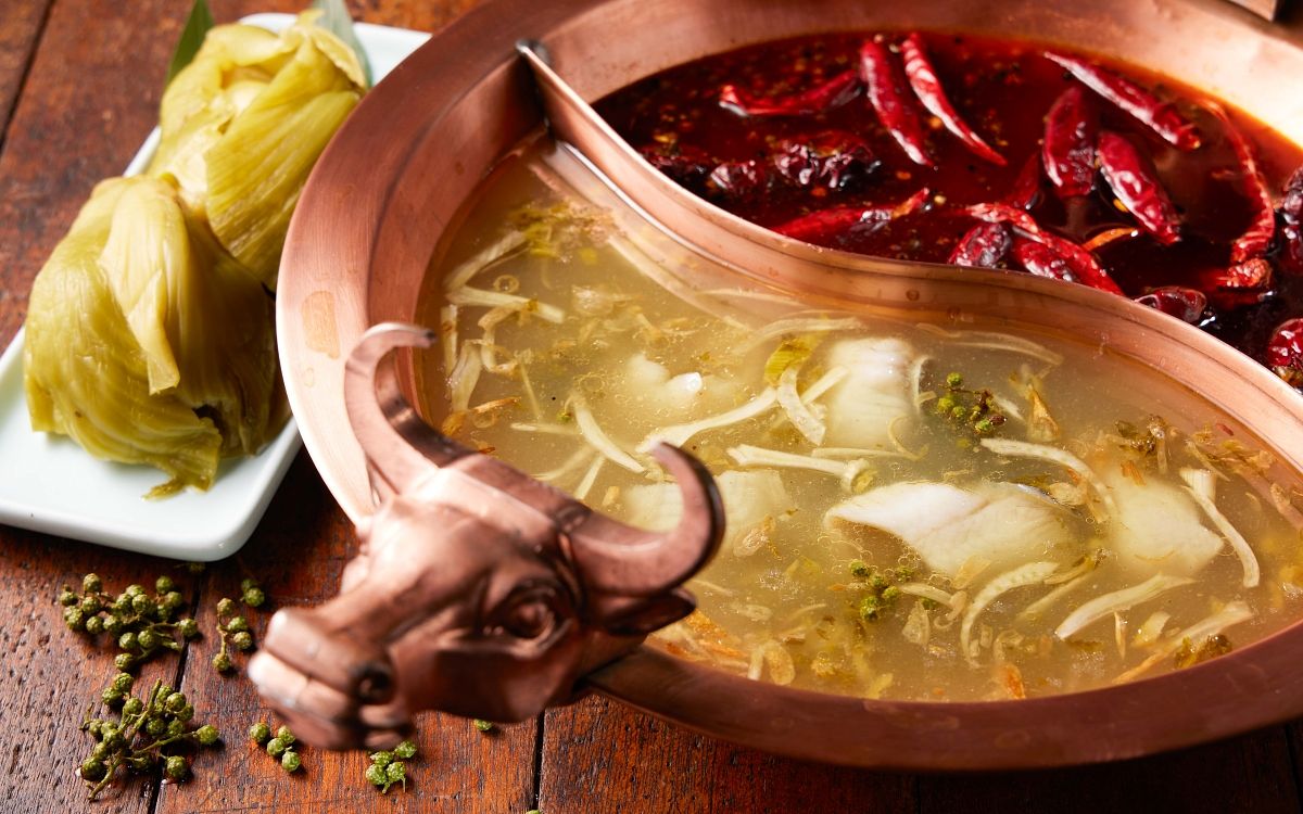 標榜全台唯一100%和牛油的重慶麻辣鍋「麻辣45」,其招牌的「九宮格麻辣鍋」不惜重本,選用產量稀少的頂級和牛牛油來精煉,獨特的辛辣風味吸引許多饕客一再上門。為了豐富賓客的味蕾,今年重磅推出「川味酸菜魚鍋」打造為新招牌鍋物,秉持著職人精神追求極致美味的堅持,嚴選來自台灣酸菜故鄉、雲林大埤鄉自產芥菜、自家醃製的「老酸菜絲」作為鍋物靈魂,加入豬骨、雞骨、四川泡椒、老薑熬煮出湯頭的酸爽清香,再灑入青花椒、鵝油蔥酥、花椒油等各式香料增添香氣層次,打造酸爽、香麻不嗆辣的「川味酸菜魚湯」。