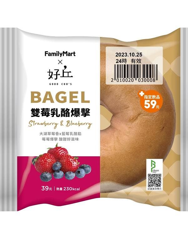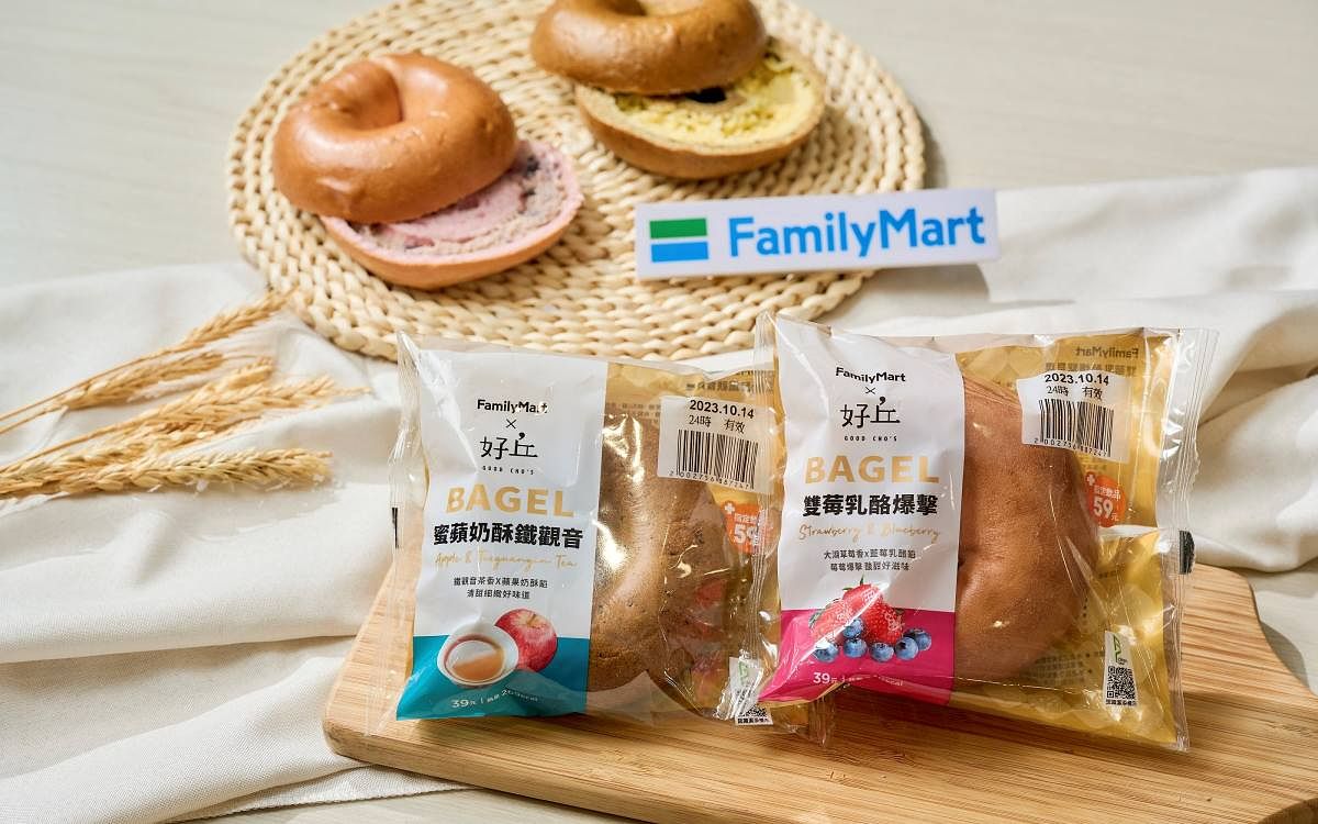 此外,「全家」更首度攜手台灣貝果第一品牌「好丘Good Cho’s」,推出2款風味質感俱佳的聯名新品「蜜蘋奶酥鐵觀音貝果」與「雙莓乳酪爆擊貝果」,以正宗燙麵製法造就渾圓飽滿的外觀與外Q內軟的嚼勁口感,更只要銅板價39元!「蜜蘋奶酥鐵觀音貝果」嚴選台灣鐵觀音入料,造就入口回甘、尾韻茶香馥郁的細緻感,內餡以蘋果乾搭配濃郁奶酥餡製成,濃郁奶香與清甜美味讓人難忘;「雙莓乳酪爆擊貝果」則以大湖草莓入料,使貝果麵包具酸甜果香,內餡則以進口藍莓乾拌入鮮奶油起司與藍莓果醬,雙莓爆擊,入口即感受酸甜好滋味!