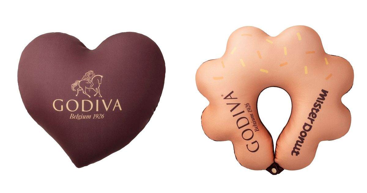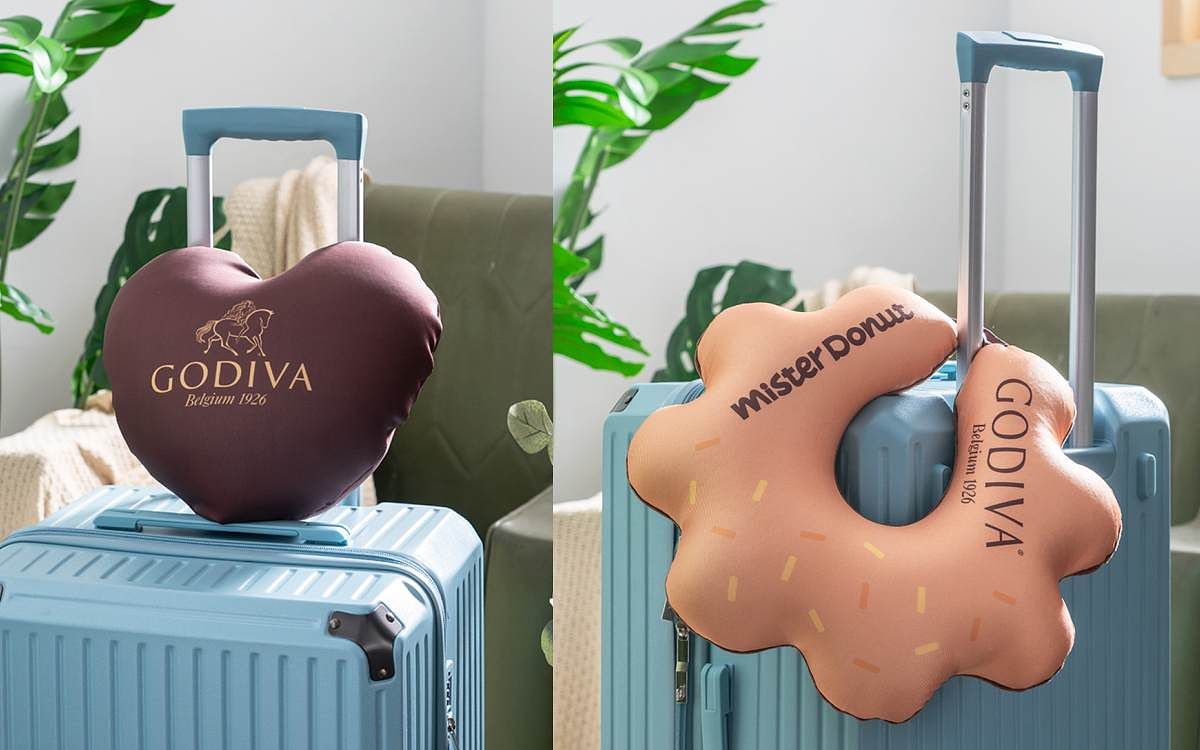 以GODIVA經典暢銷心型巧克力結合Mister Donut當紅波堤甜甜圈打造旅行必備好物,頸枕還可以翻轉成抱枕,輕鬆兩用好攜帶!