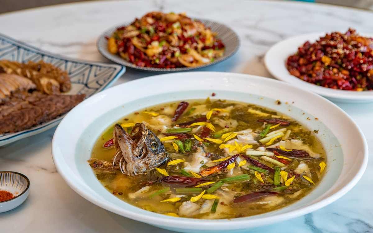 圖片來源:鵝川鵝川招牌菜「老罈子酸菜魚」使用獨家醃製的酸菜製作,強調嚴選每日清晨直送、當日現殺的山泉鱸魚,讓顧客吃到最新鮮的軟嫩肉質,將山泉鱸魚加入炒過的酸菜、箭筍、金針菇、薄切的百頁豆腐等豐富配料摻入高湯一起熬煮,不多加調味,光是特製酸菜的酸、香、鹹就十分夠味,最後上桌前還會淋上熱油燙過的乾辣椒和花椒粒,使鮮味提升、香氣滿溢。特別的是,每份酸菜魚更放入酥炸魚頭,與坊間的酸菜魚大不相同。酸香夠味且口感爽脆的酸菜搭配滑嫩的鱸魚肉片,再加上豐富的配料,這道「老罈子酸菜魚」視覺和味覺皆滿足了饕客的需求。為滿足喜好麻辣口味的顧客,還可選擇「青花椒魚」及「麻辣水煮魚」讓大家麻得過癮、辣得歡心。