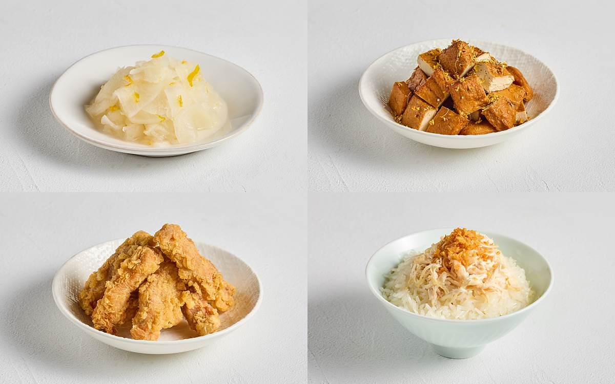 吃麵不無聊!涼菜均一價68元。執行董事劉素華說:「一碗麵配滿桌菜,簡單吃也能大滿足。」因此在研發小菜時做足功課,添加日本香柚皮醃漬的「柚香蘿蔔」爽脆酸甜,嚐過濃郁蝦湯後嚼上幾片,恰有清口妙用。「桂花冰釀豆乾」則是以特調的桂花梅汁醃泡入味,入口軟Q清爽、齒頰留香。「里肌酥肉」是將肥少瘦多的豬大里肌切條,醃漬後裹麵衣油炸,酥脆香美,單吃或加入湯麵中都是一絕。還有援引日式拉麵文化補充澱粉質的人氣單品「蒜味雞絲香米飯」,粒粒分明的香米飯淋上自煉蒜酥與蒜油,鋪上手切舒肥雞絲,香氣與口感層層堆疊,相當討喜。