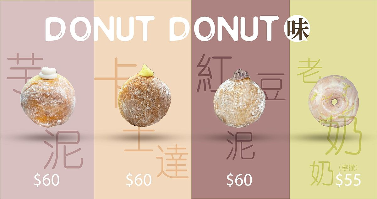 目前一共推出六種口味,包含「芋泥、卡士達、紅豆泥、巧克力花生」四種包餡生甜甜圈,加上「老奶奶檸檬、杏仁白巧克力」兩種中空甜甜圈,都是使用日本製法的生甜甜圈麵糰製作,兩種型態的生甜甜圈完全是不同風味與感受,根本就該每種口味都來一顆!都好好吃~