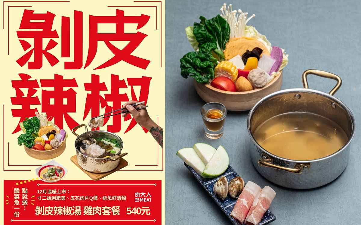 位在台北市東區216巷的肉大人火鍋SHABU,自12月13日起增添新菜色,除原有的發酵湯底火鍋:經典酸白菜、濃郁蒜頭釀味噌、重口味泡椒麻辣,最新加入湯品「剝皮辣椒湯底」;熟食單點除了阿嬤的紅蘿蔔肉燥、老實人麻辣麵、肉旨房現煎漢堡肉排,還有現下最夯的酸菜魚和麻辣臭豆腐,餐後甜點古早味輕乳酪蛋糕,許多搶先品嚐過的常客們都讚不絕口。