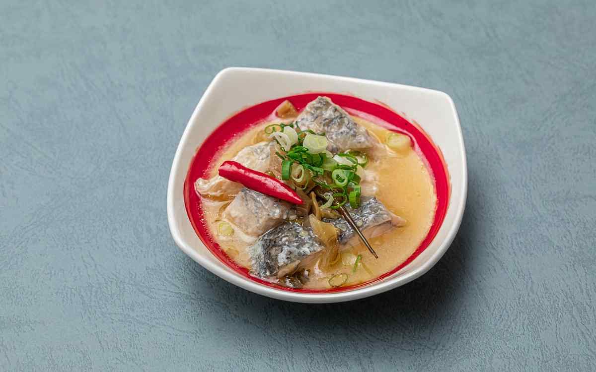 先以中火油炒花椒瀝出花椒辣油備用,再起鍋炒大量的新鮮蒜頭、紅辣椒,台南延齡堂吳老爺自製的酸菜炒出辣嗆味後加水淹過炒料至沸騰,加入新鮮的魚片煮到鮮嫩全熟起鍋裝盤,花椒辣油覆熱後淋在魚片表面就大功告成,炮製出酸菜的鹹香、花椒的麻辣、魚片的鮮甜,六種味道的交織堆疊出複雜而多變的美味,層次豐富、酸爽開胃的酸菜魚,一口下肚把一整天的工作壓力全解放。
